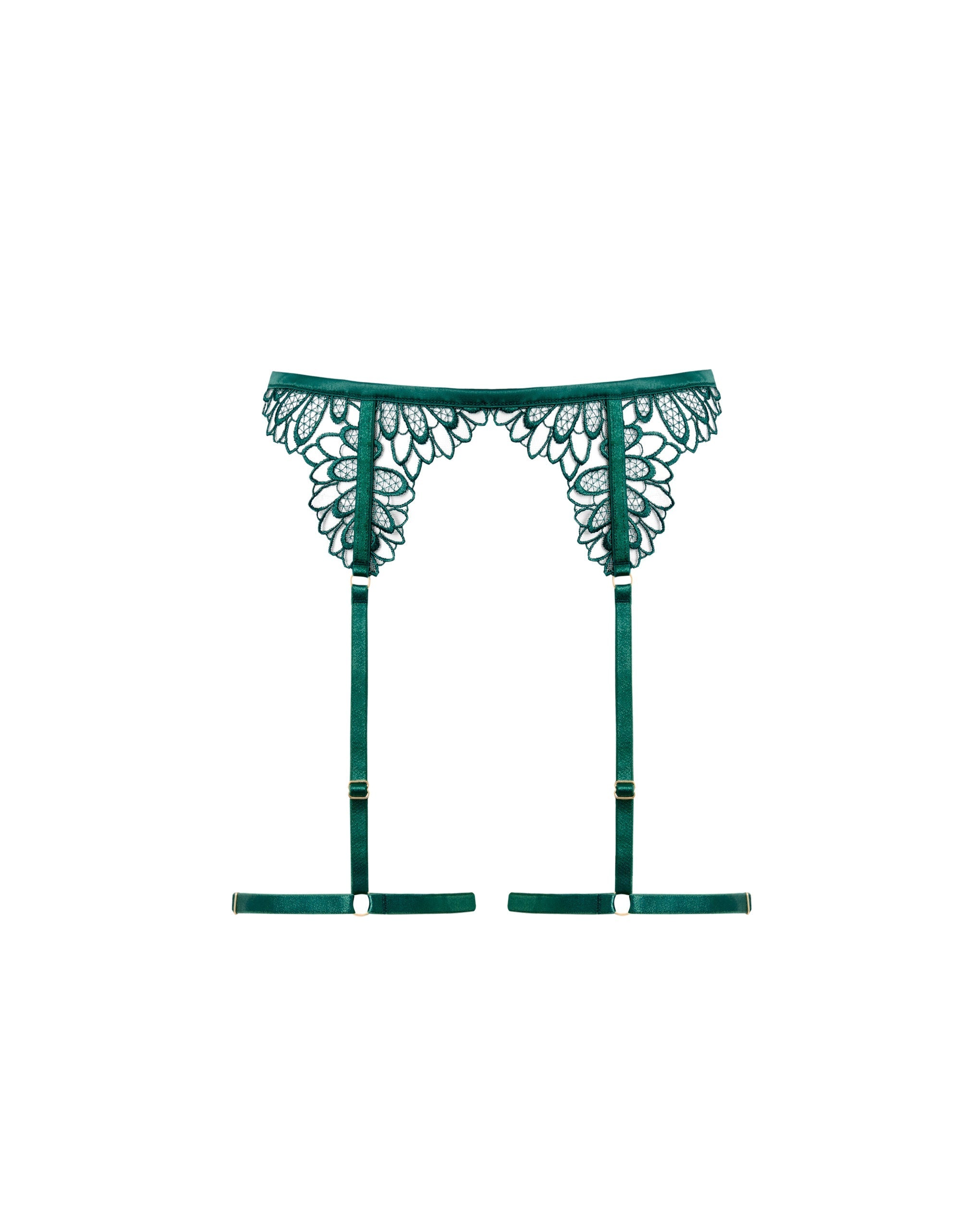 This statement piece features bespoke floral abstraction embroidery on a suspender belt and thigh harness, with elastic straps secured by an adjustable swan hook fastening for a personalized fit.