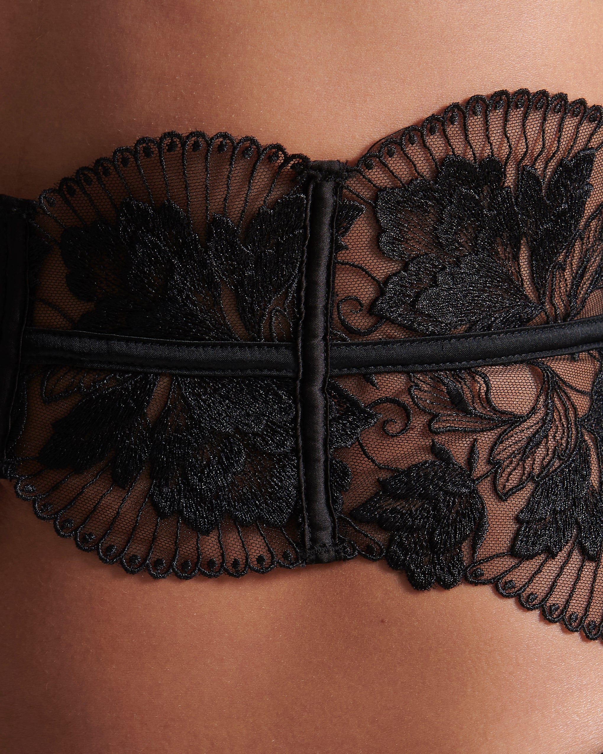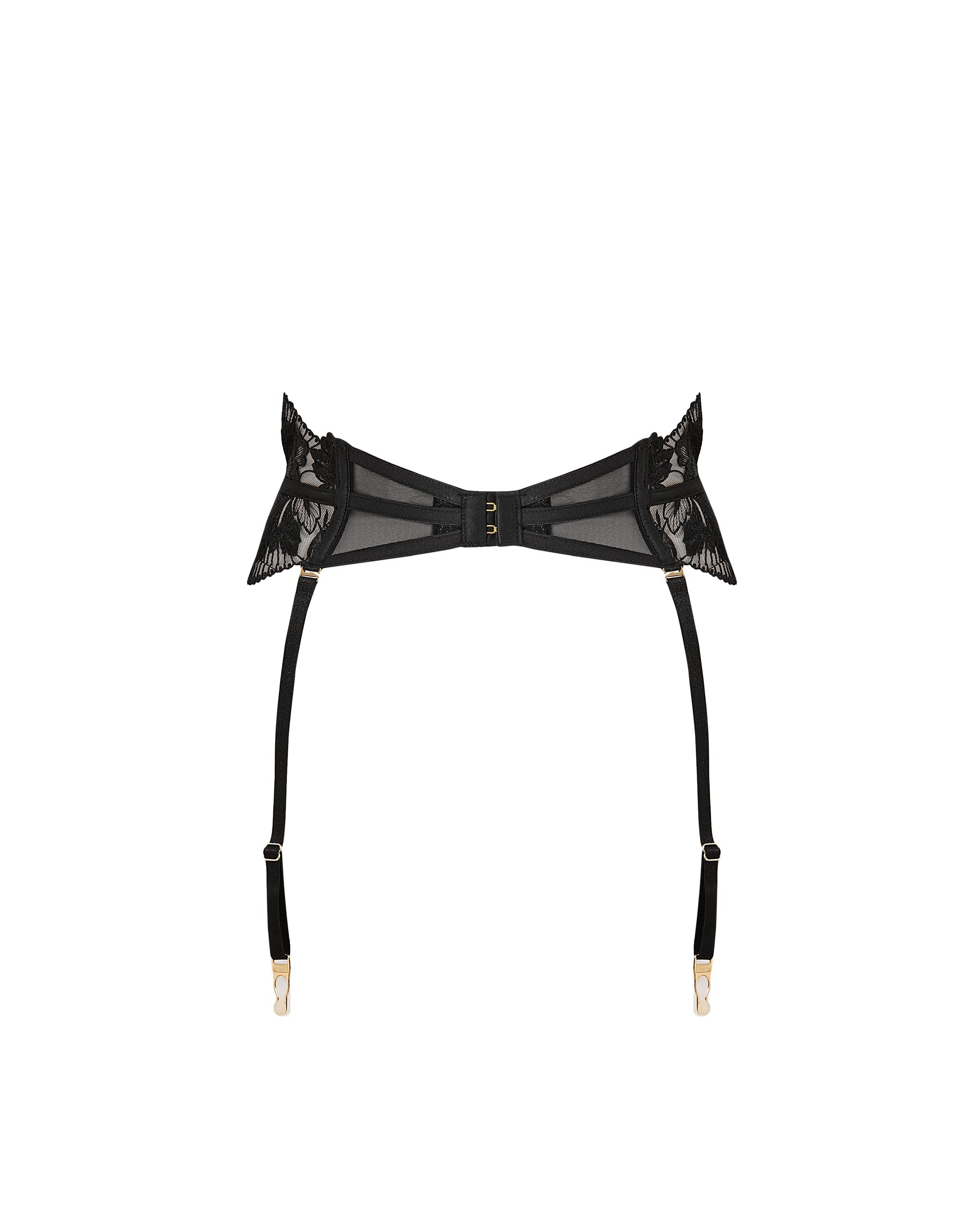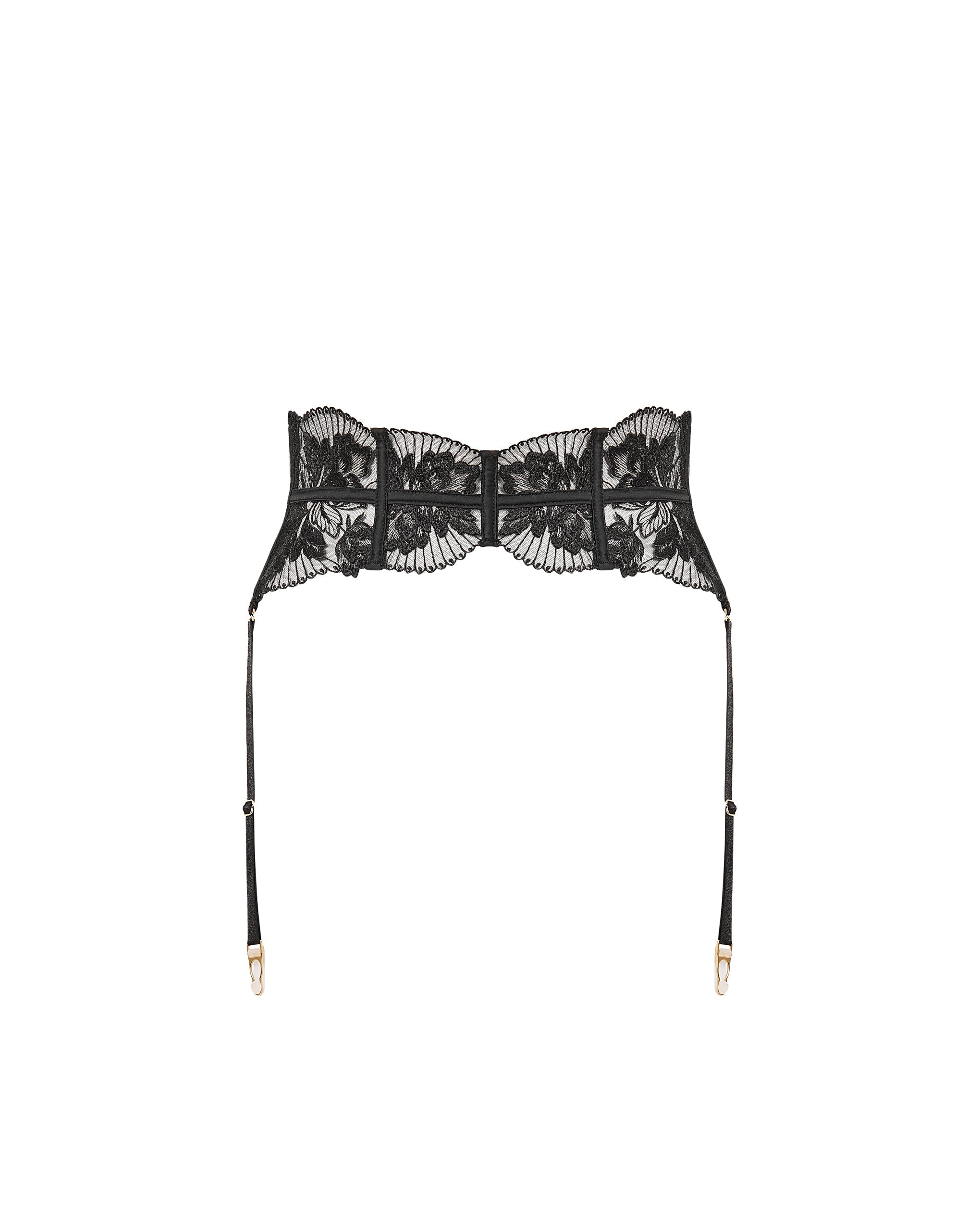 This unique garter belt highlights your silhouette with a distinctive pleated fan design, crafted from sheer lace with delicate floral embroidery and finished with elegant gold-tone hardware. The adjustable thigh suspender straps and rear hook-and-eye fastening ensure a personalized and secure fit.