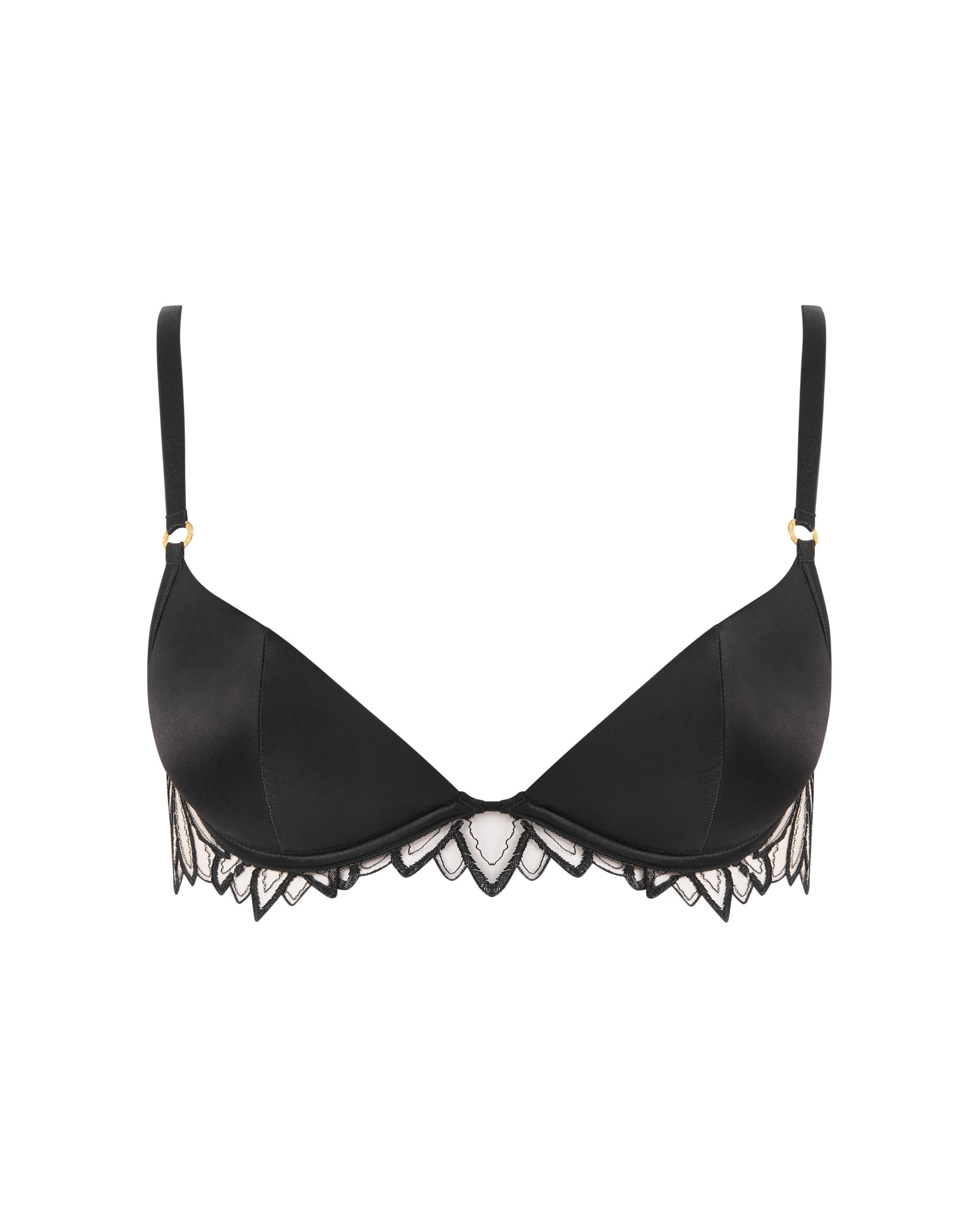 The molded, padded cups provide lift and definition, while the sheer mesh panels with botanical embroidery create an alluring, textured look. The smooth adjustable straps and rear fastening ensure a personalized, comfortable fit.