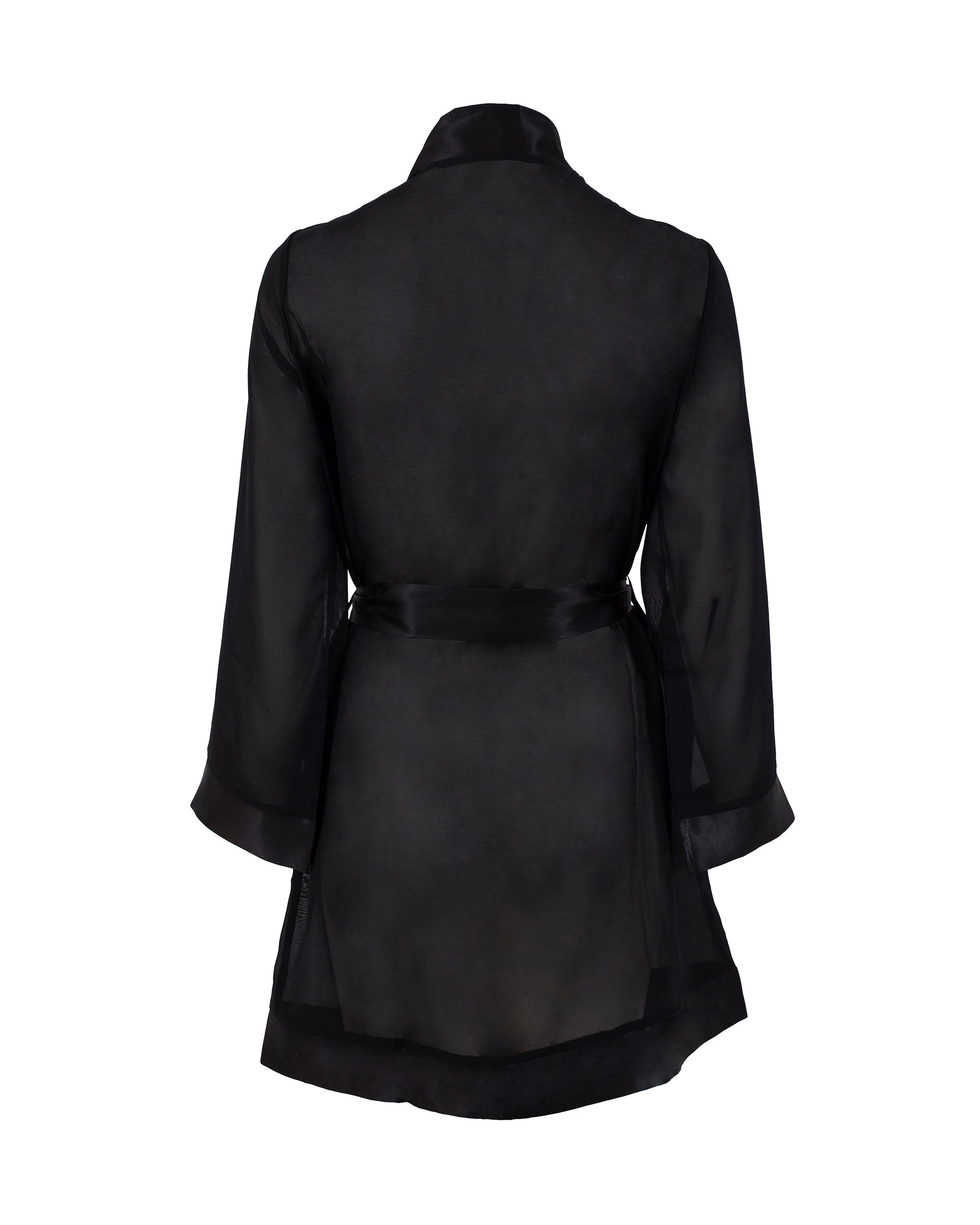 This piece features a semi-sheer chiffon that adds a light, provocative feel, edged with deep satin trim for an opulent touch and textural indulgence. It has a loose sleeve for a relaxed fit and a long satin tie to cinch the waist.