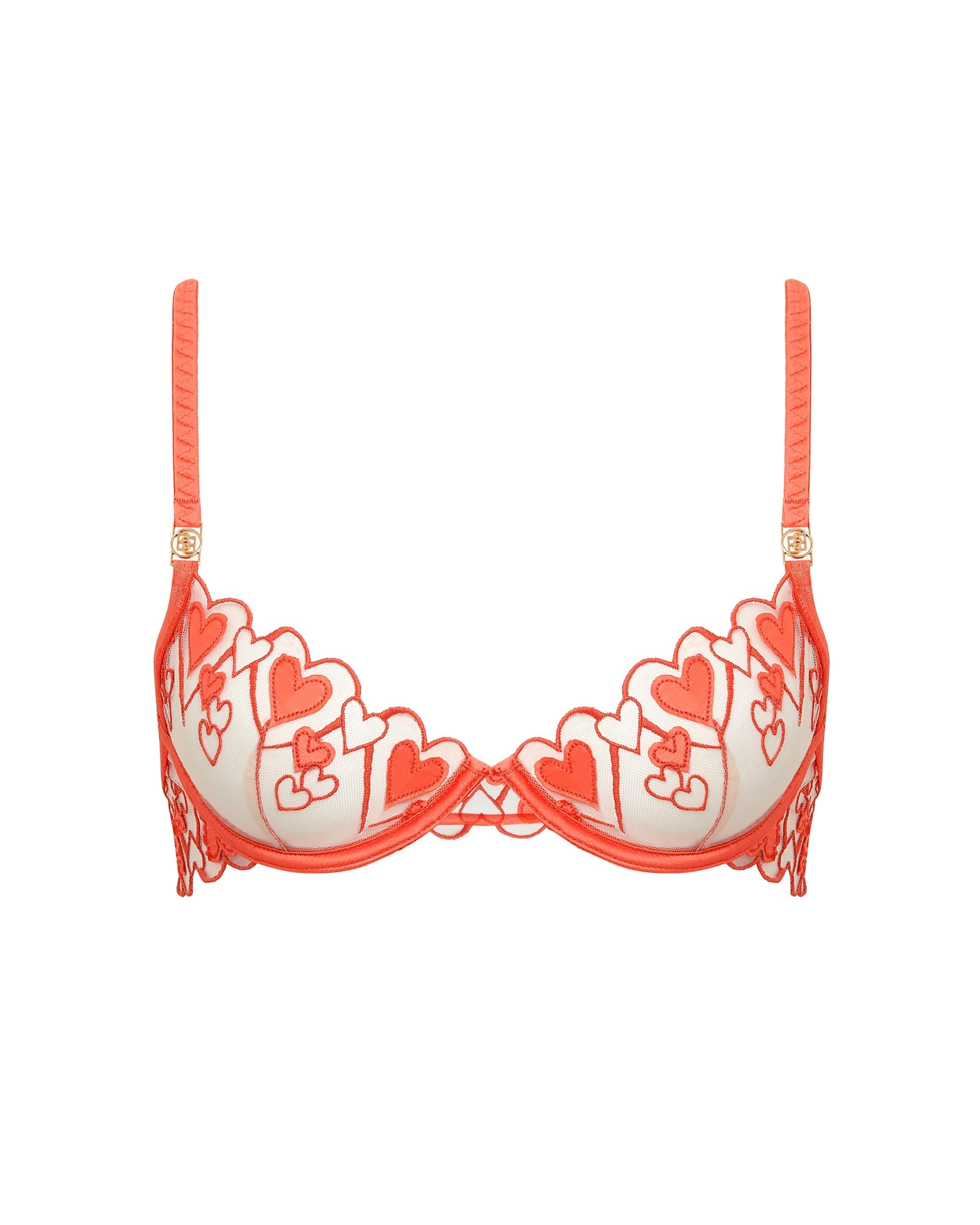 Romantic and feminine, featuring delicate heart embroidery atop sheer mesh fabric with elegant scalloped edges, underwired cups, and adjustable straps for a tailored fit.