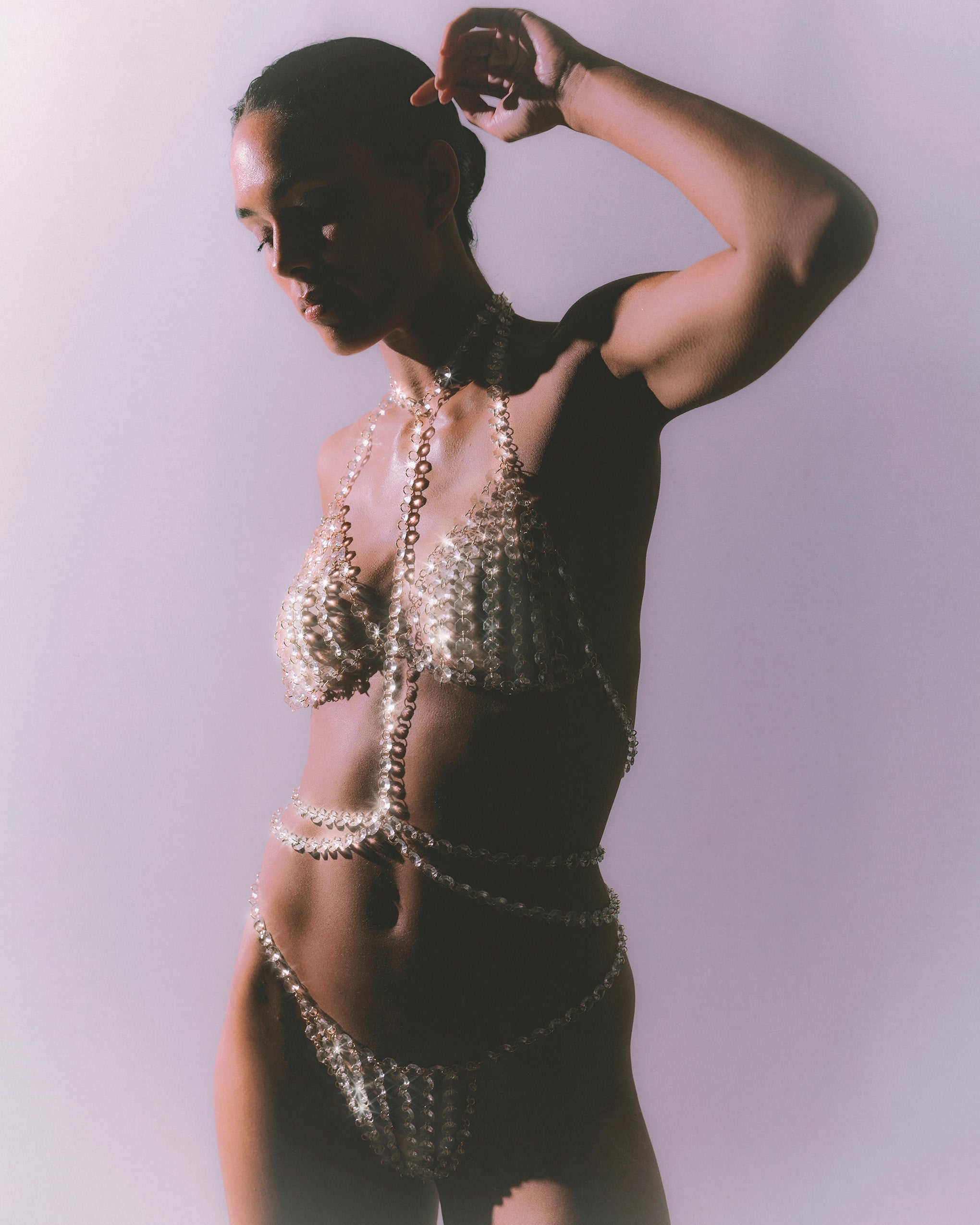 The harness drapes fluidly over the body, with an adjustable clasp for a secure and custom fit that moves with you.