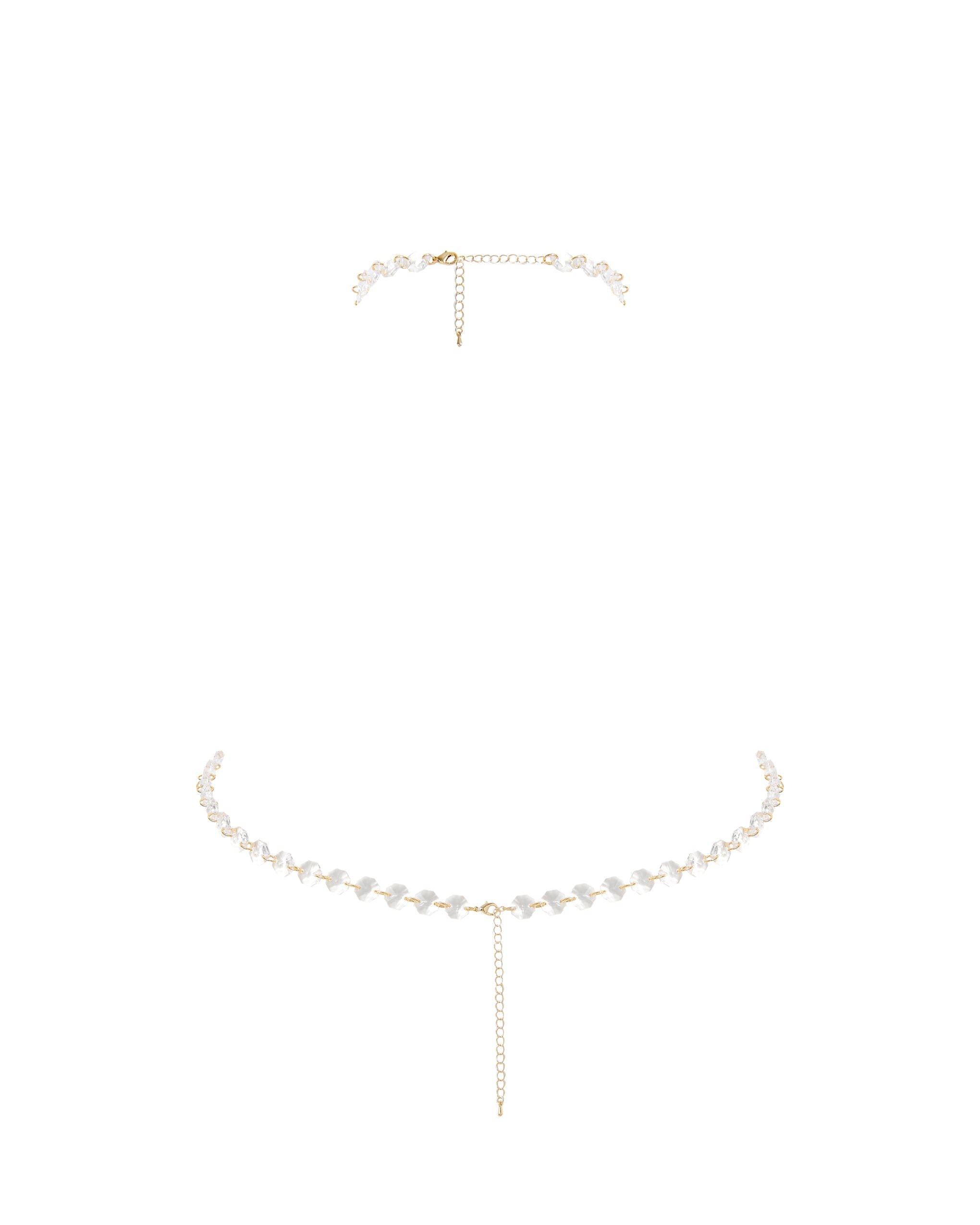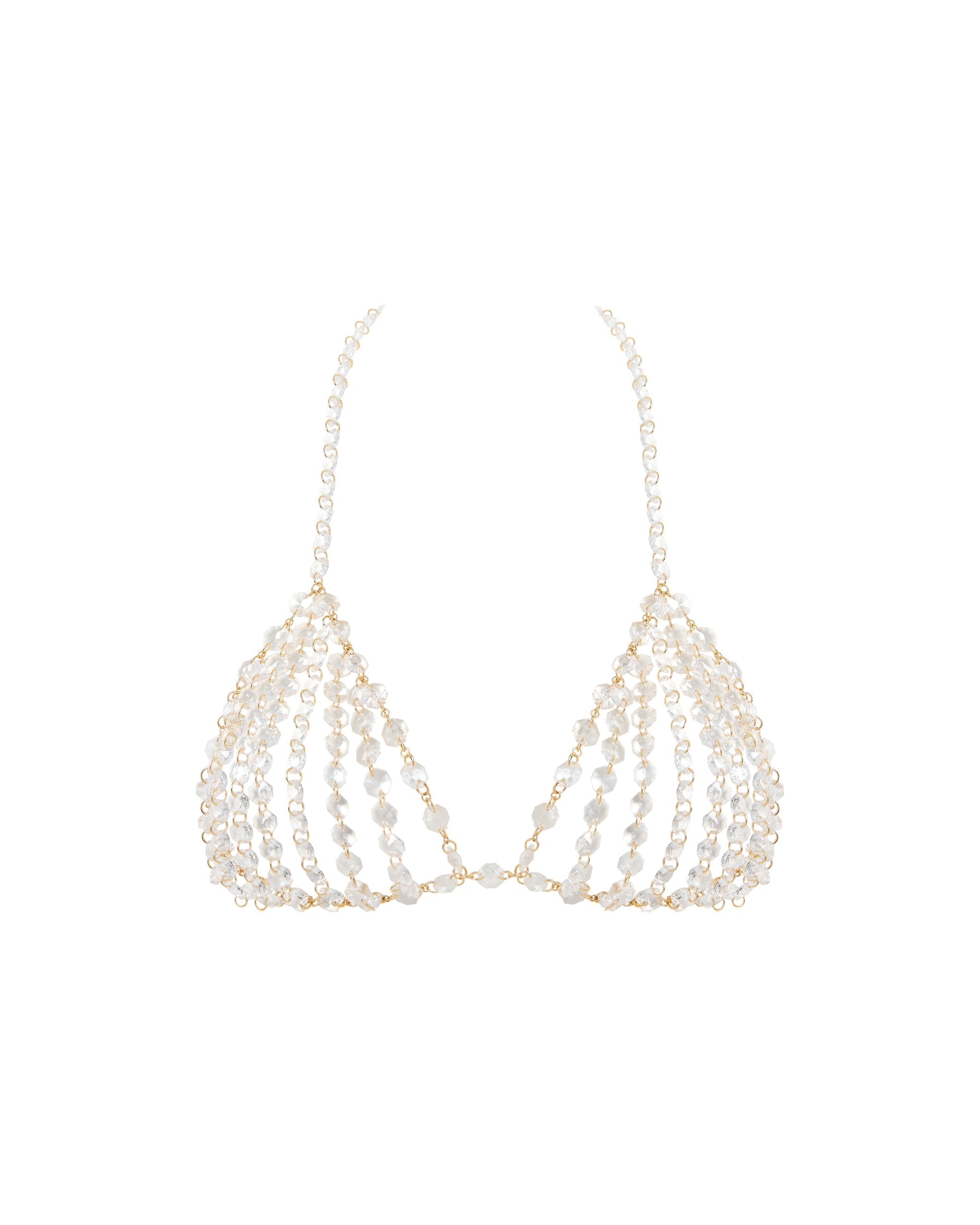 The Crystal Triangle Bra is a hand-crafted piece featuring octagonal beads and an open gold chain construction that drapes elegantly across the bust. It has an adjustable lobster clasp closure for a tailored fit in a flattering triangle silhouette.