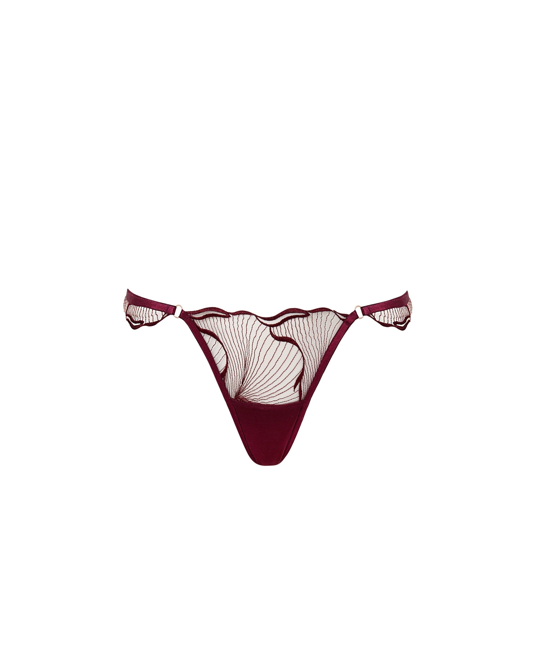 Showcasing delicate directional embroidery and scalloped edging, this sheer thong features a unique triangle keyhole detail and a gentle bamboo gusset that combines intricate style with everyday comfort.
