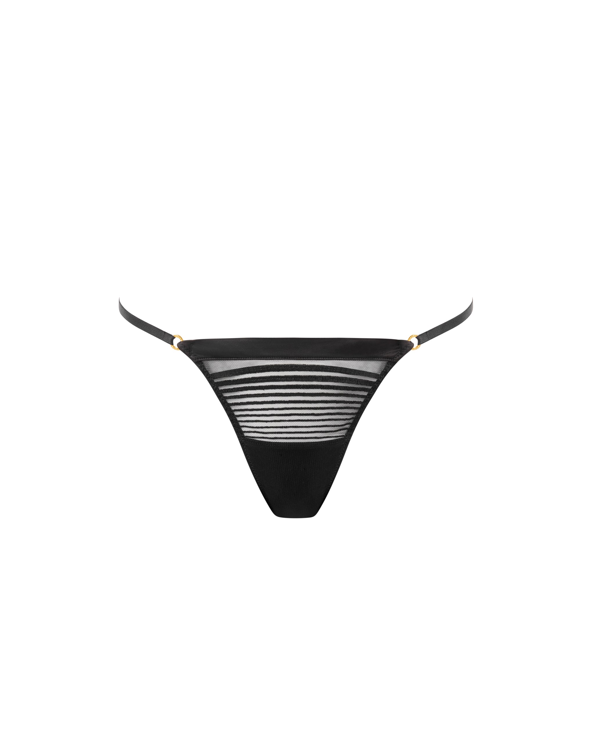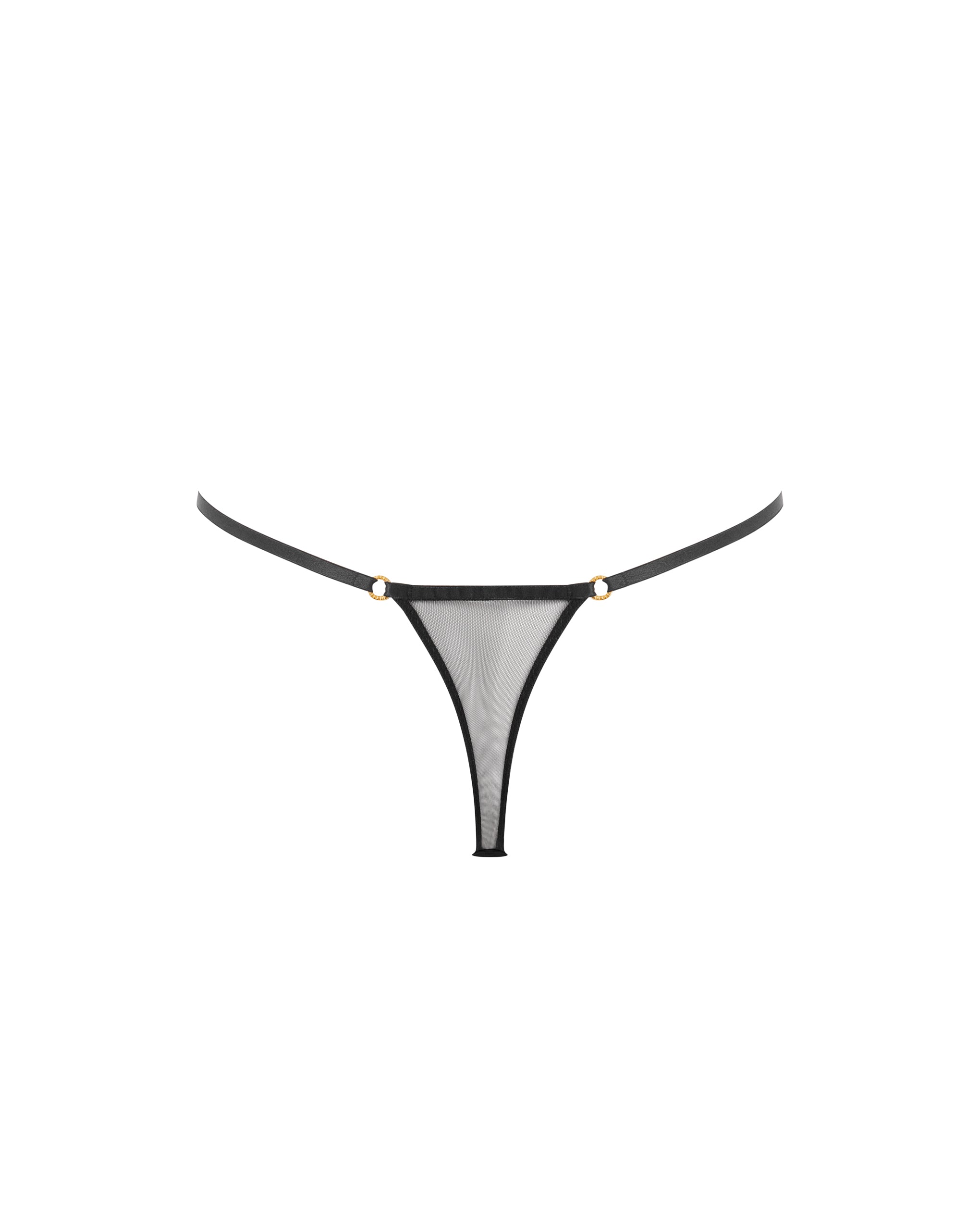 The thong features a directional linear embroidered design across the front panel with a mid-rise fit and a sheer mesh G-string back for a clean, minimal finish under clothing. Signature hardware adds a delicate touch, while the hypoallergenic bamboo gusset ensures all-day comfort. Pair it with the matching longline bra for a confident, coordinated look.