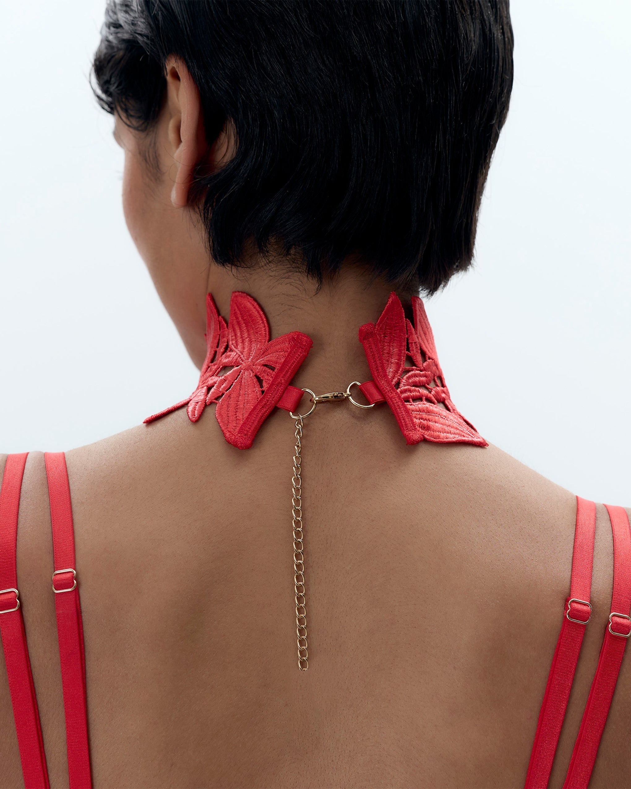 This choker features intricate floral guipure lace and an adjustable clasp for a comfortable, personalized fit. It is a one-size accessory crafted from recycled materials.