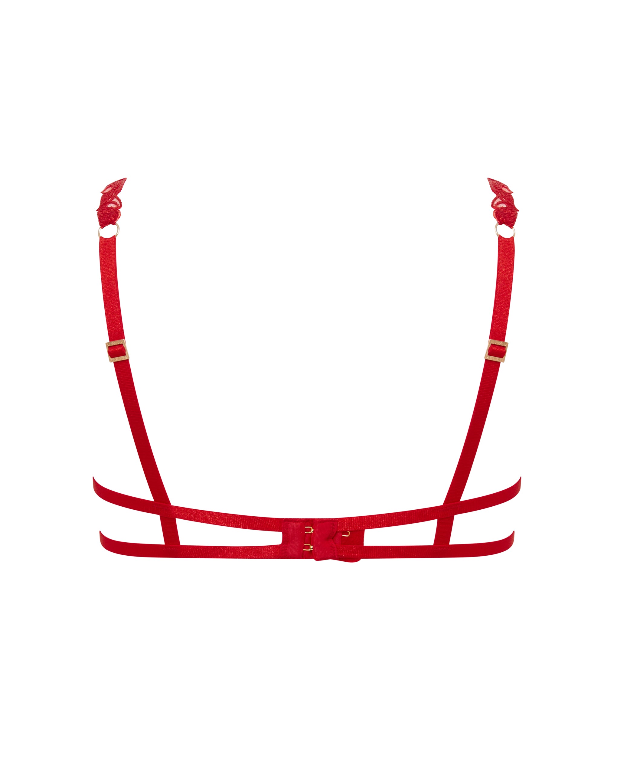 This piece features open construction with directional strapping and delicate floral applique, creating a trendy and eye-catching design that is made to be seen. The wired silhouette offers support and shape, while the fiery red hue adds a touch of passion and drama.