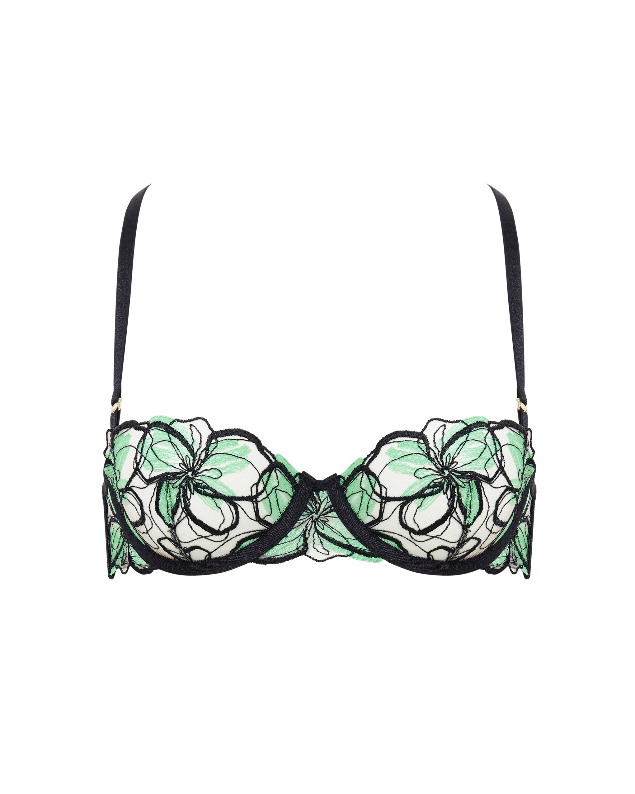 The Odette Floral Balcony Bra is an artful demi bra featuring exquisite craftsmanship that replicates a floral watercolor painting, with tri-color lace and embroidery, underwired support, adjustable shoulder straps with delicate metalwork, and a rear hook-and-eye fastening.