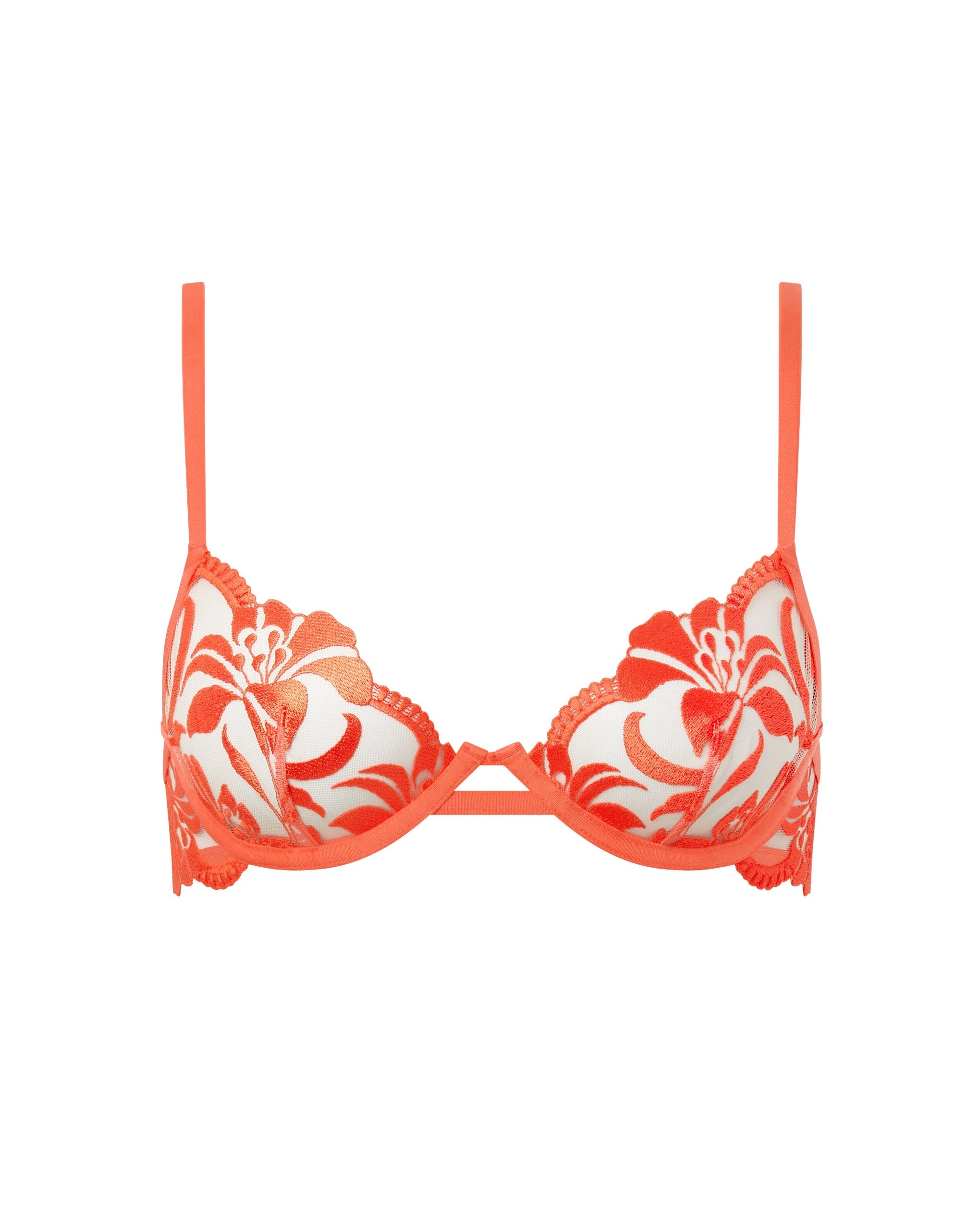 This piece features intricate floral embroidery on a semi-sheer mesh finish, creating a captivating look that graces your silhouette with elegance. The coral hue adds a warm, romantic glow to your skin.
