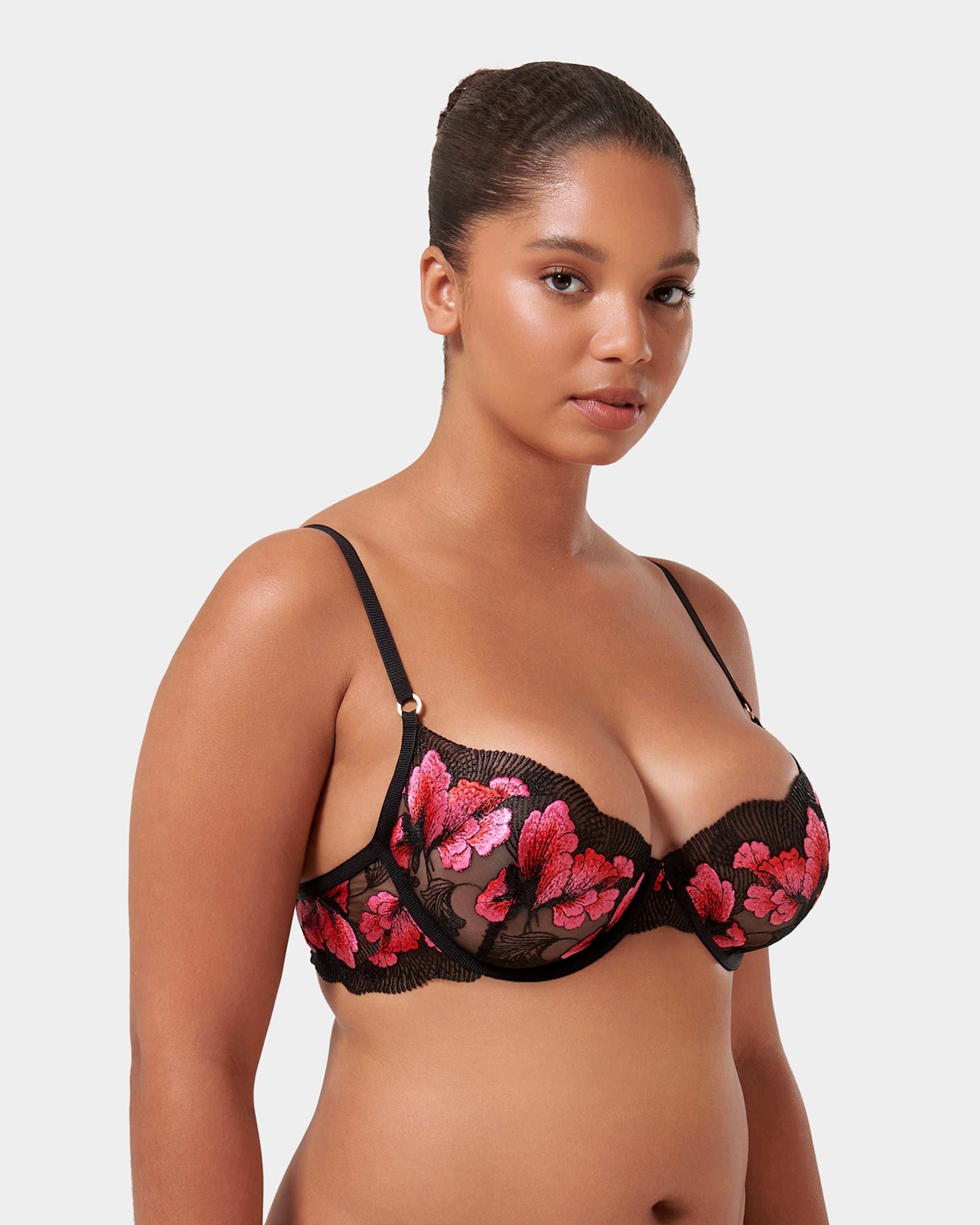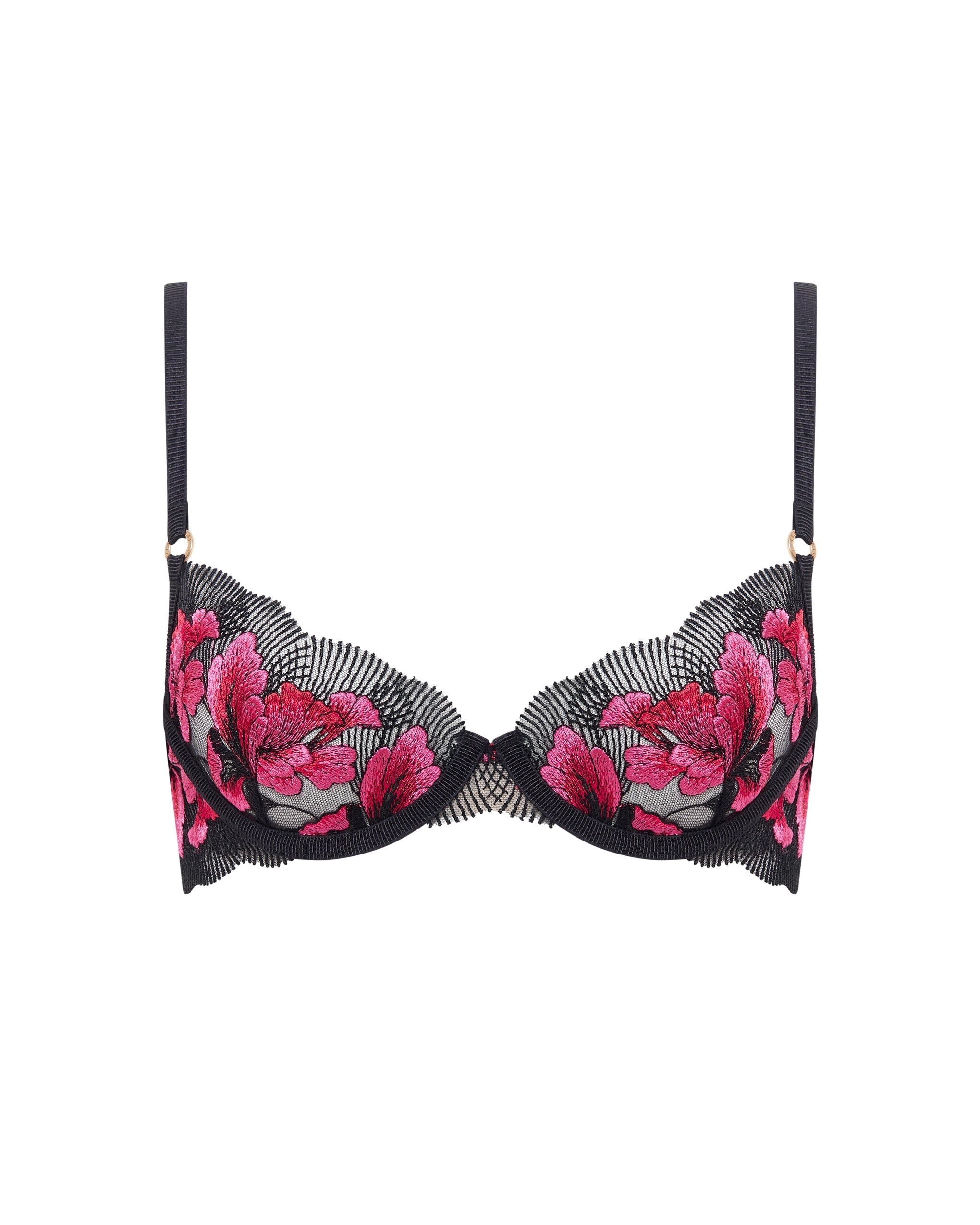 This underwired bra features striking floral embroidery against soft mesh, with adjustable straps and a secure hook-and-eye fastening for a personalized, supportive fit that feels as beautiful as it looks.