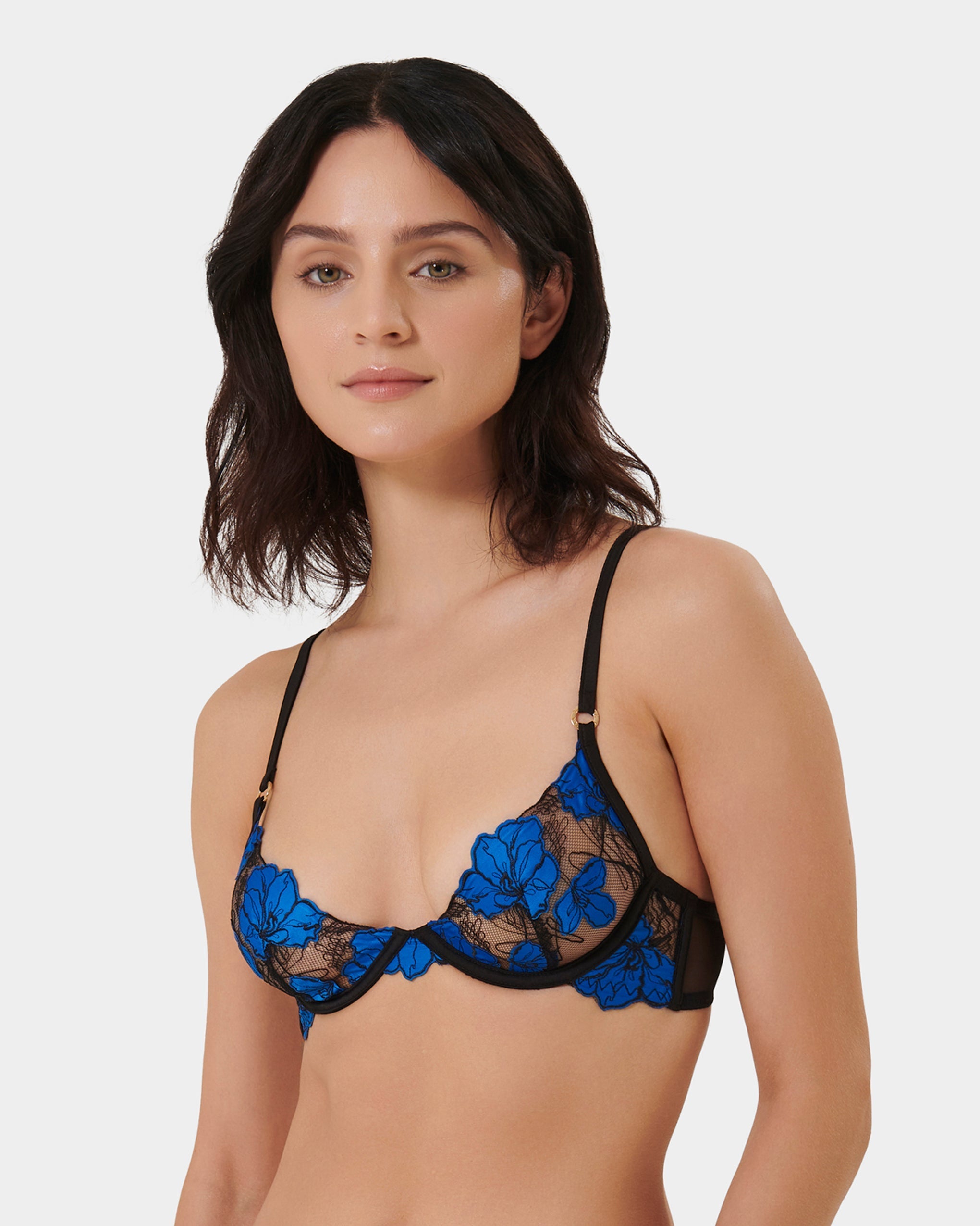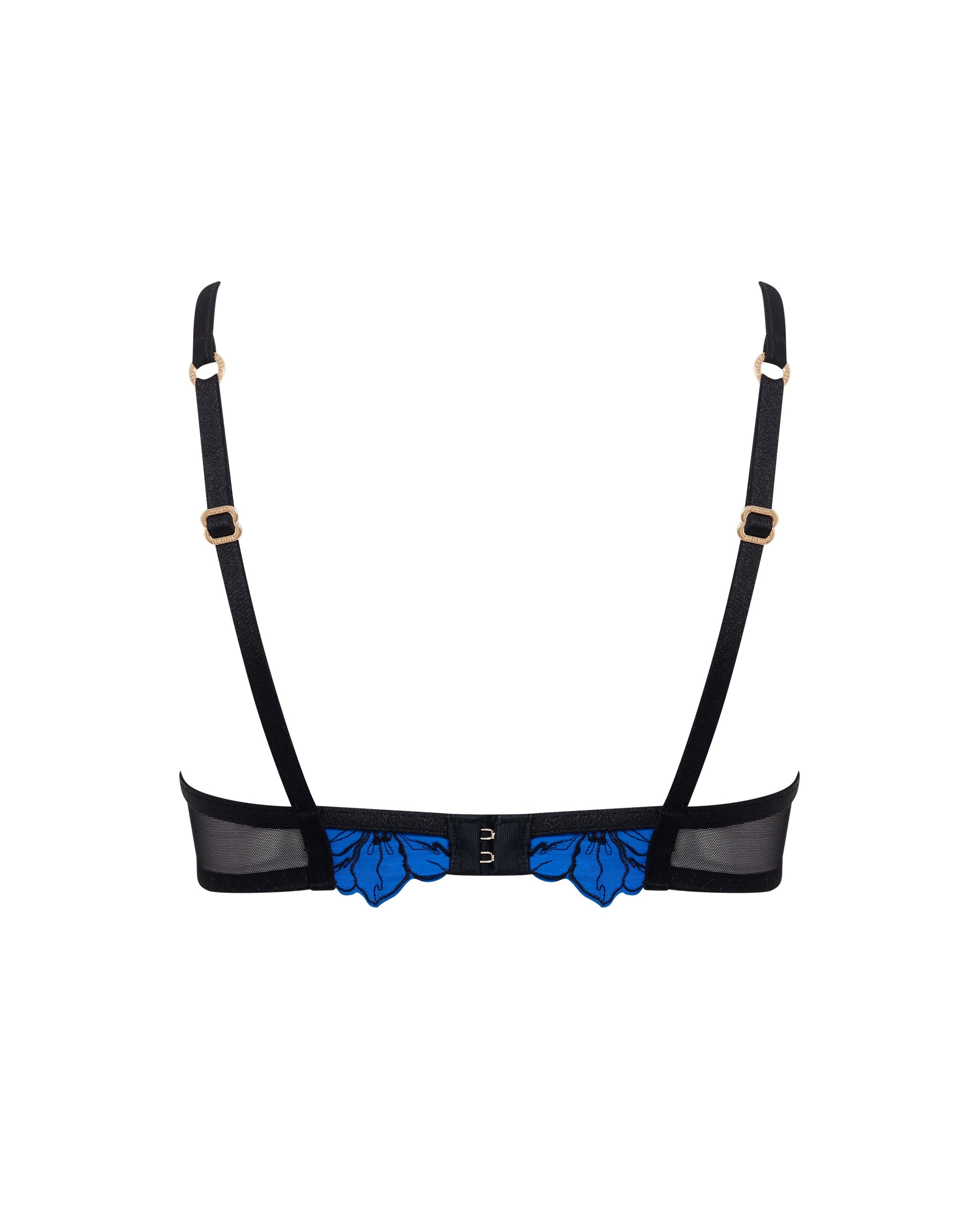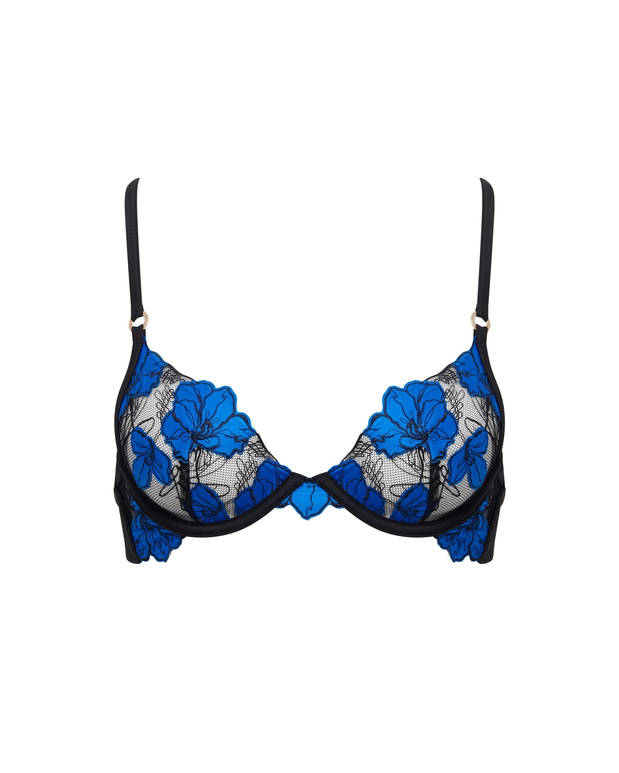This underwired plunge bra features striking floral embroidery on sheer mesh, with adjustable straps and a secure hook-and-eye fastening for a personalized, supportive fit.
