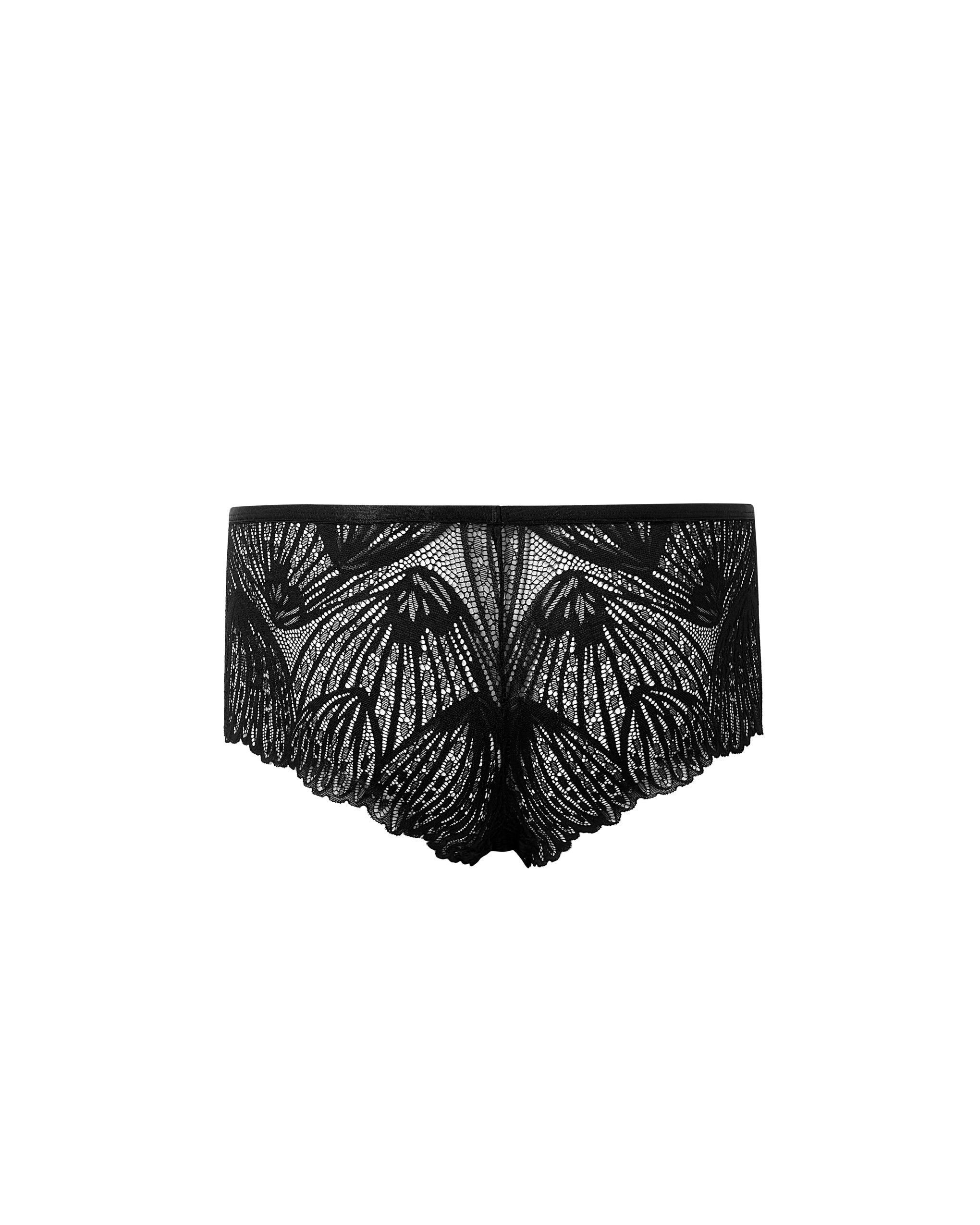 Presented in classic black, this low-rise, short-style panty features floral lace that flows around the entire silhouette, premium satin bonded edging, and a hypoallergenic bamboo gusset. This style is perfect for those looking for added coverage without compromising on a beautiful, detailed look.