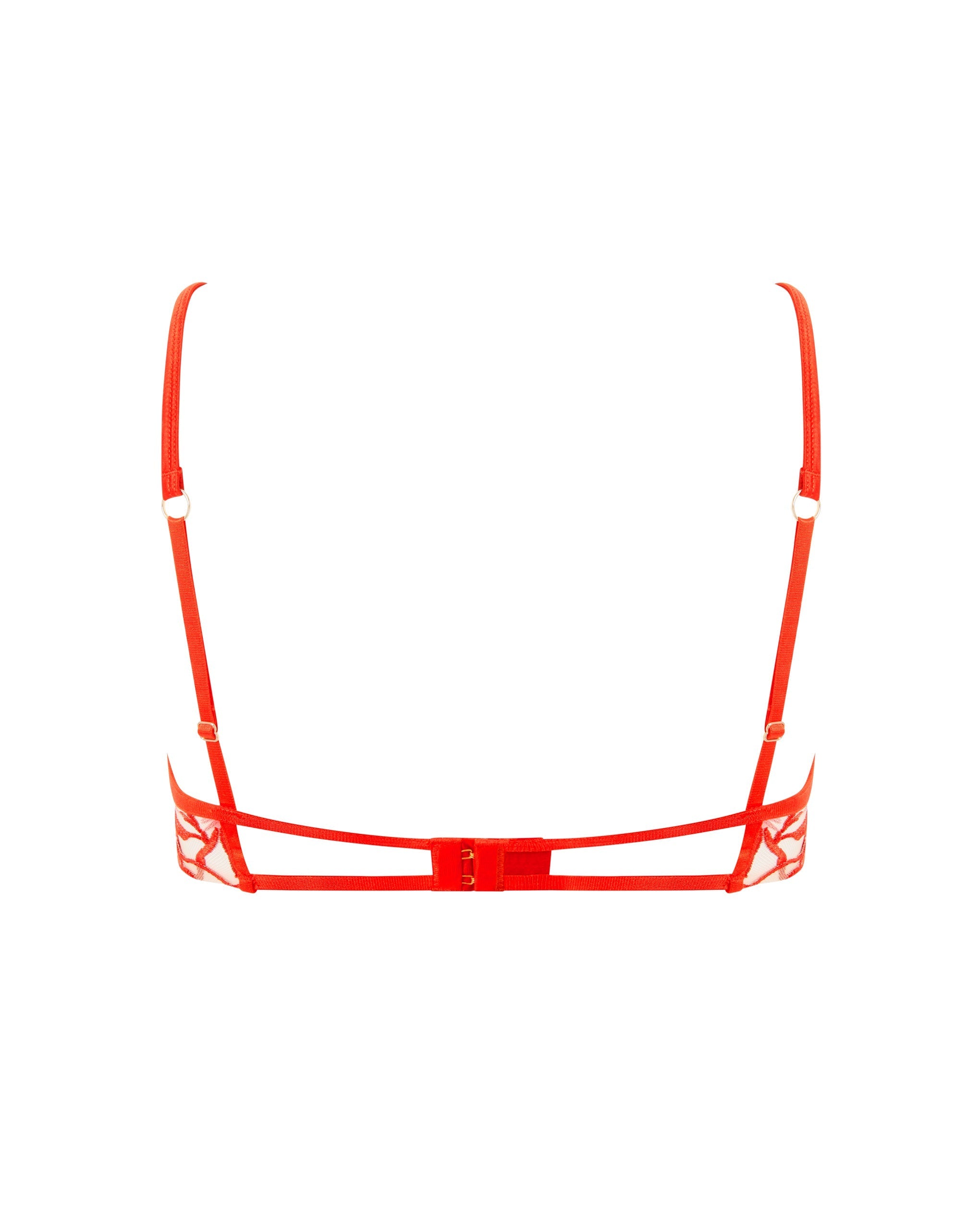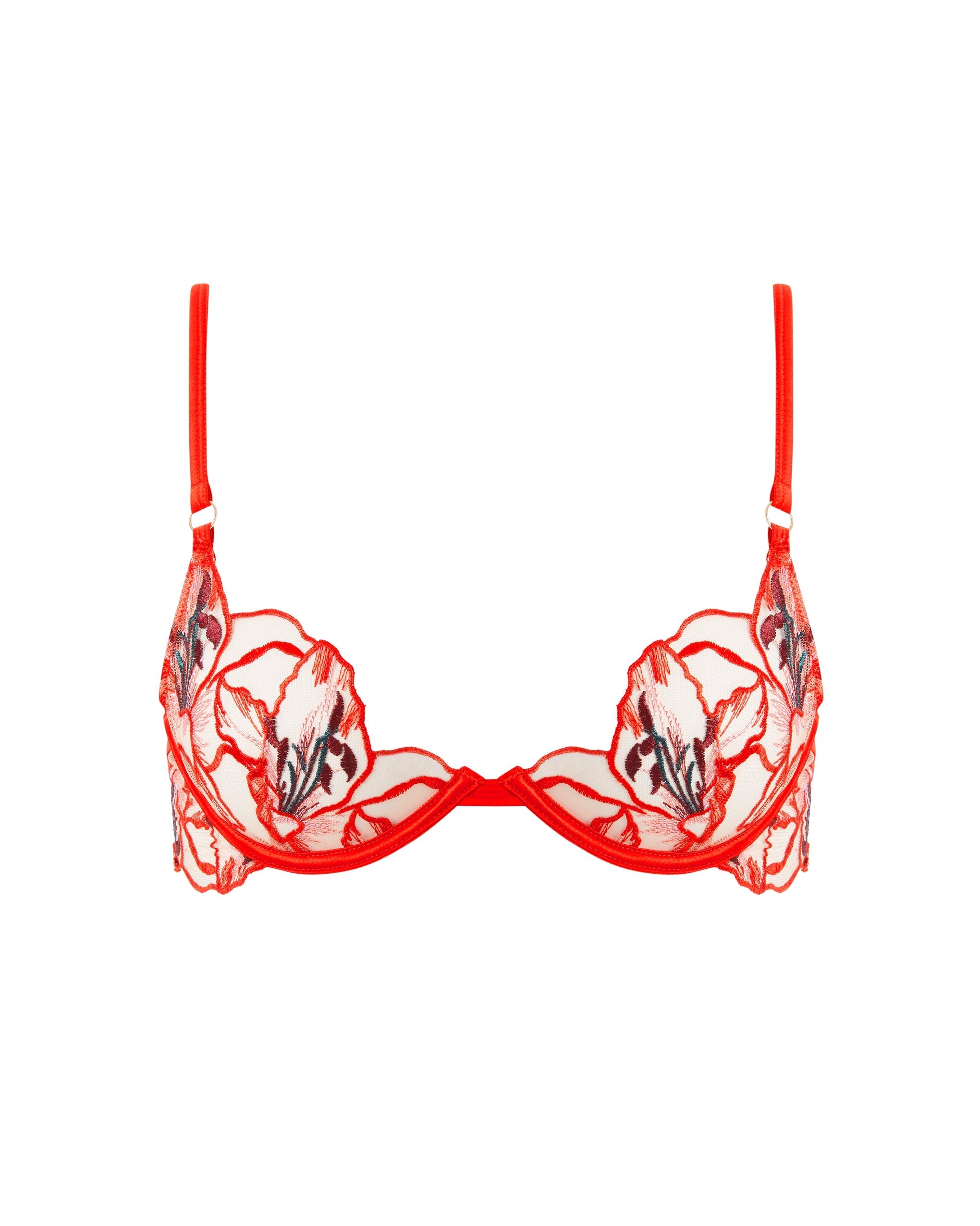 This bra features demi cups with sculpted, scalloped edges and underwire for subtle lift and a beautifully contoured shape. The tonal floral embroidery adds textural dimension to sheer mesh panels, finished with silken threads for a luxurious feel. Quilted satin straps are fully adjustable with a rear hook-and-eye fastening.