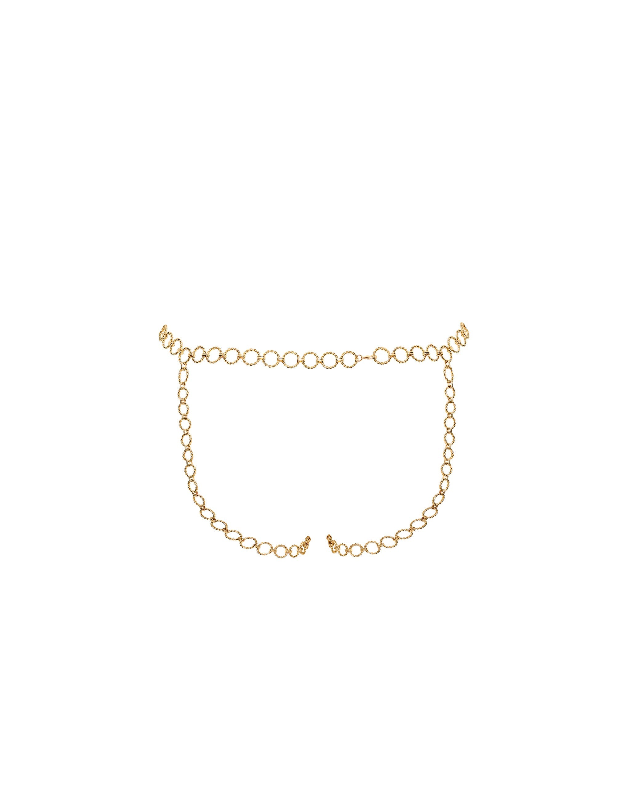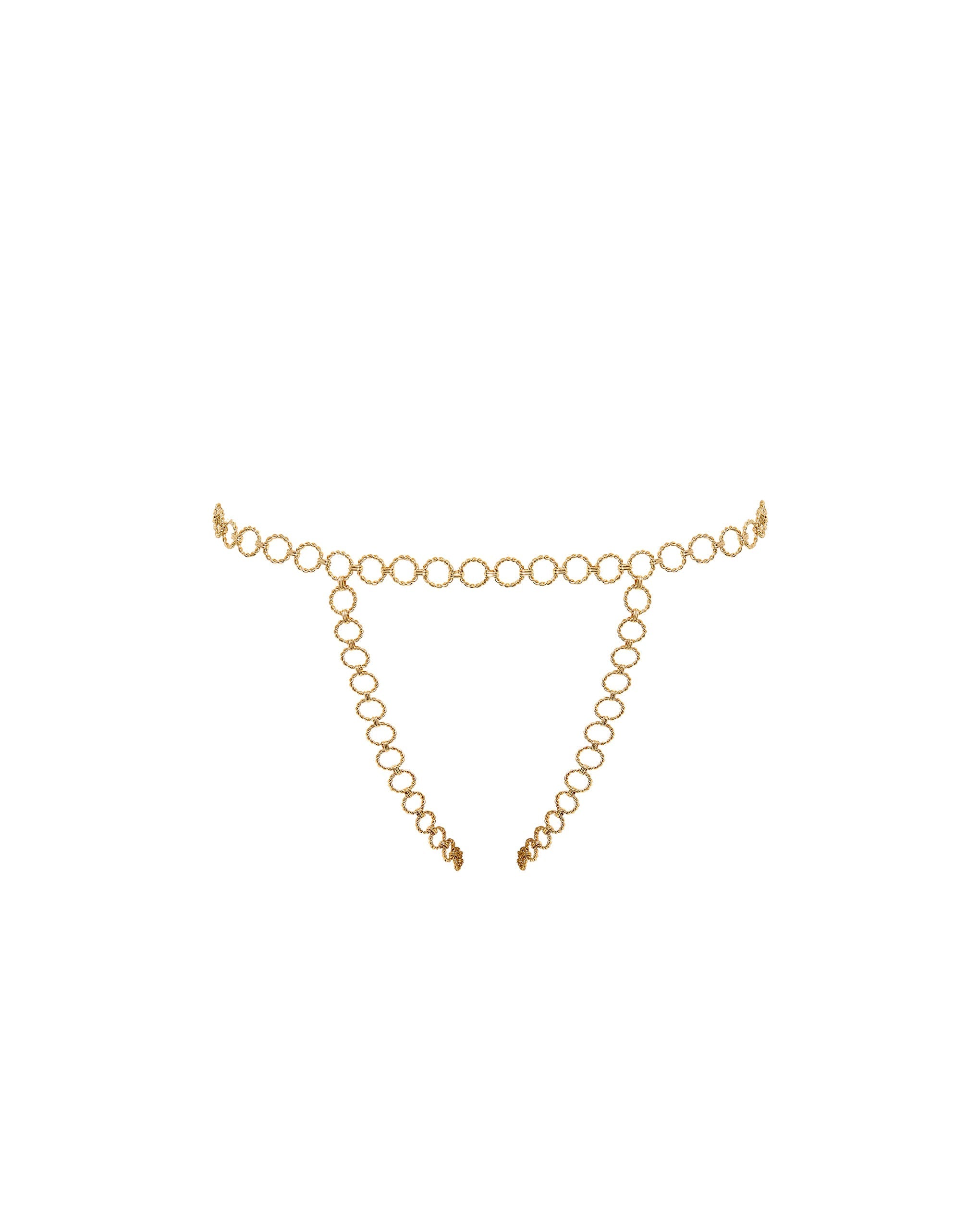 Its intricate chain construction delicately adorns the hips, creating a standout feature that pushes boundaries with a bold golden hue and an open, elegant brief silhouette.