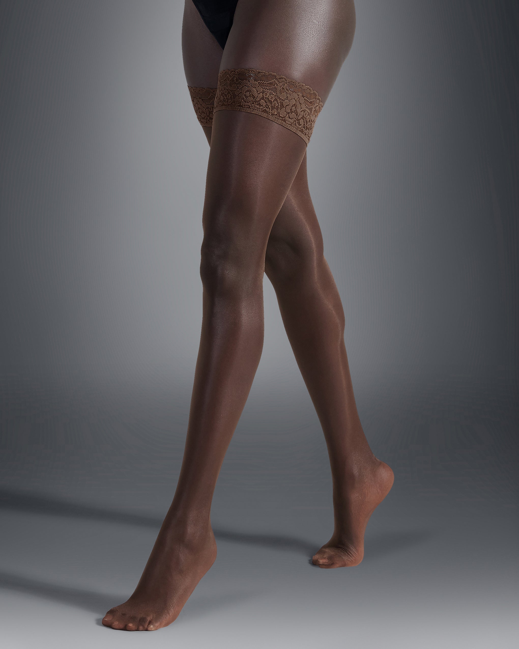 These premium thigh highs feature a wide, deep lace top for an opulent feel and softly ribbed silicone bands that keep them securely and comfortably in place. The sheer, soft yarns caress the skin for a flawless, silky finish.