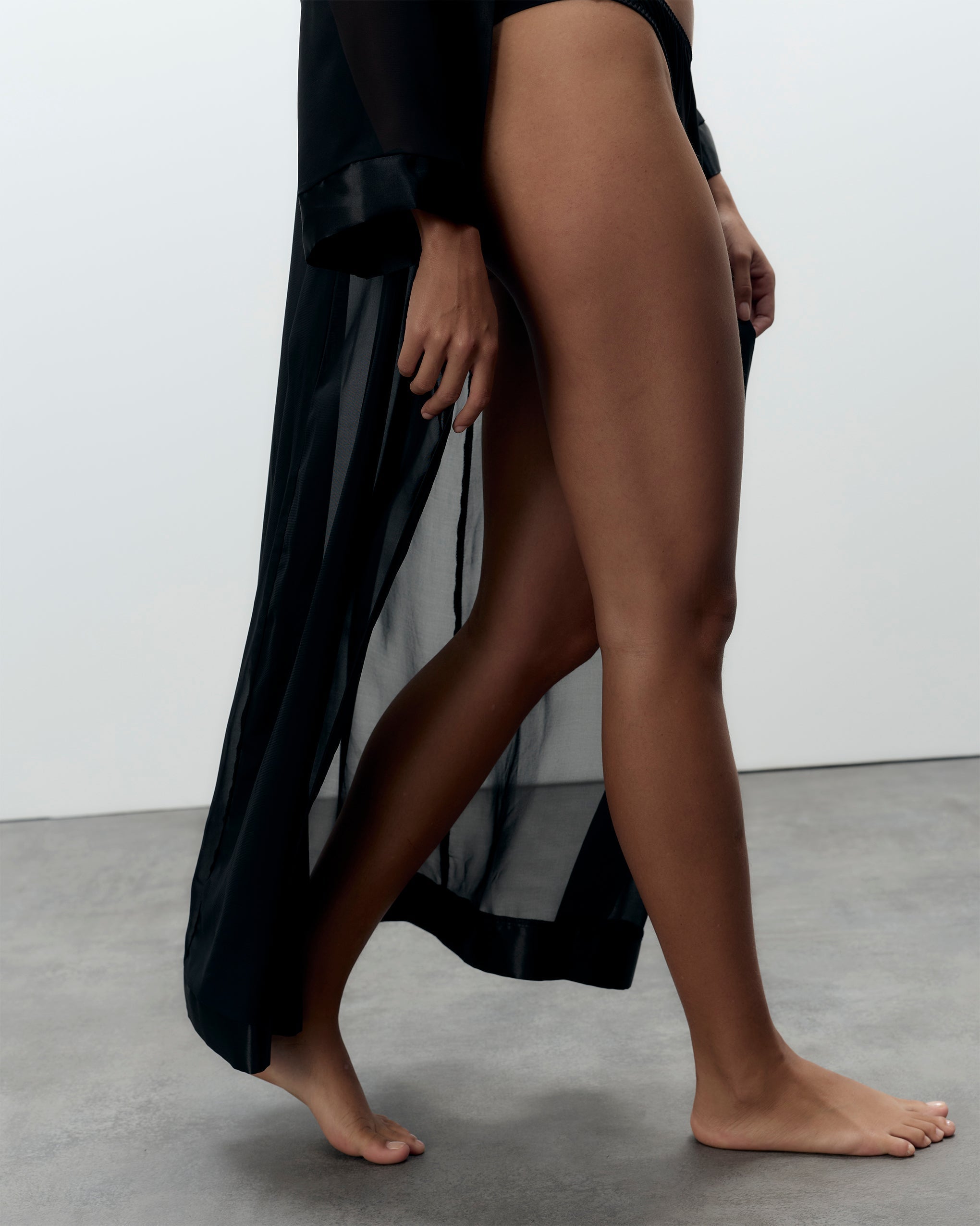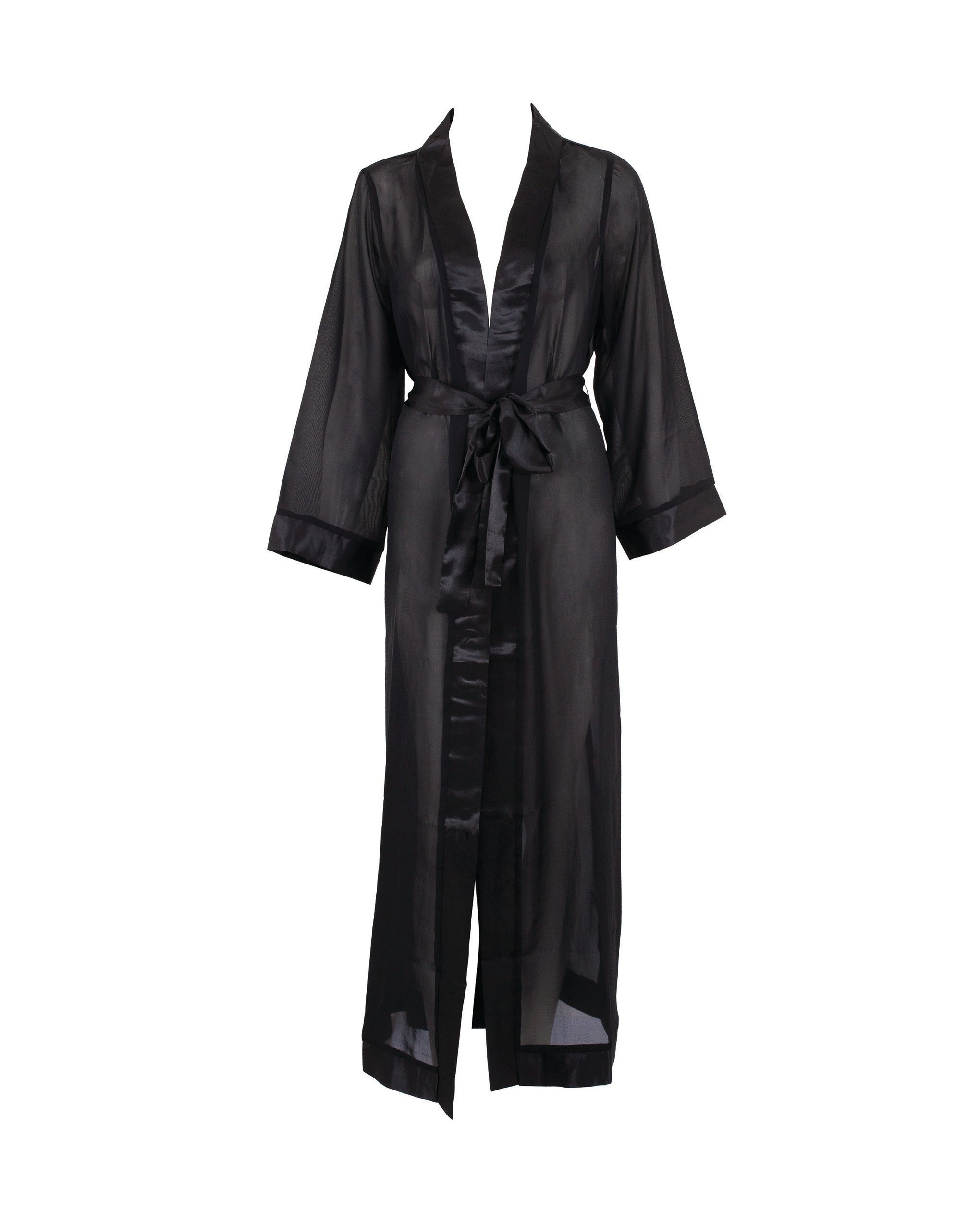 This full-length kimono is crafted from sheer, flowing chiffon and edged with deep satin trim along the front and cuffs, finished with a satin waist tie for a graceful, adjustable fit. The loose sleeves and lightweight fabric create a relaxed, airy silhouette that moves with you.