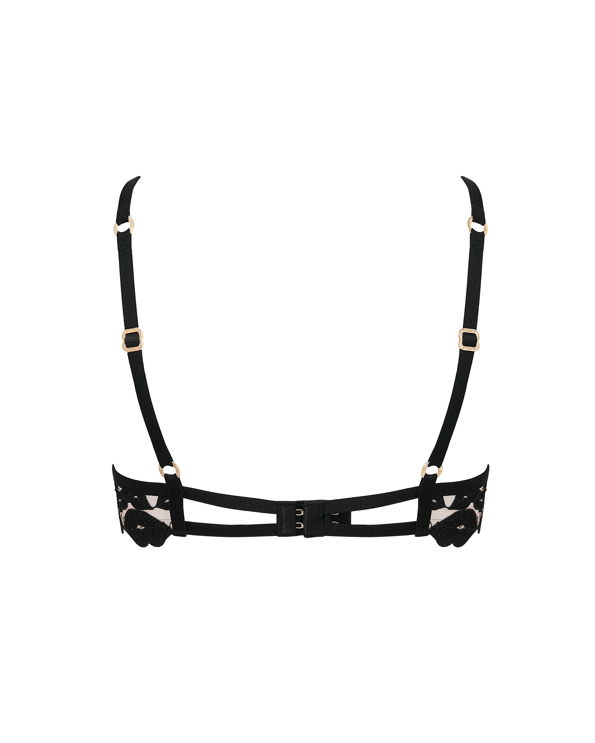 This sleek plunge bra features delicate lip-shaped embroidery and is finished with subtle gold-tone hardware for a touch of glamour.