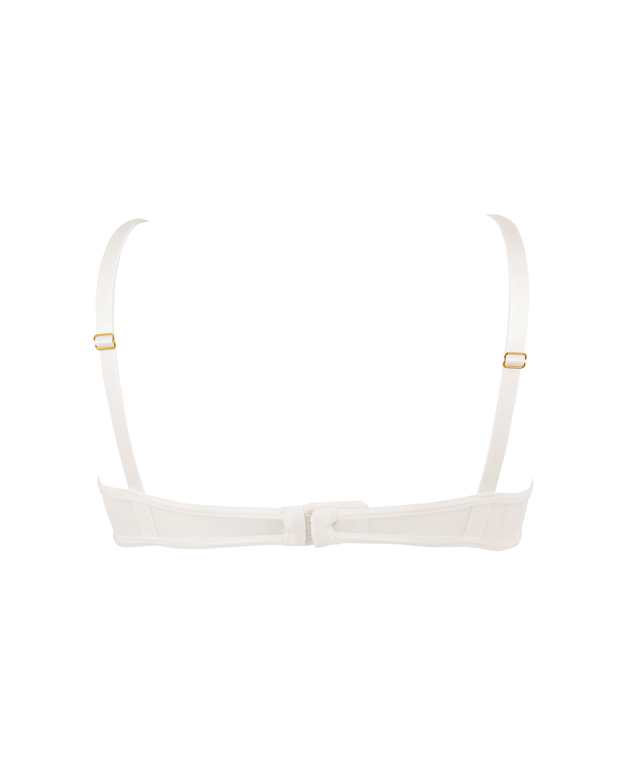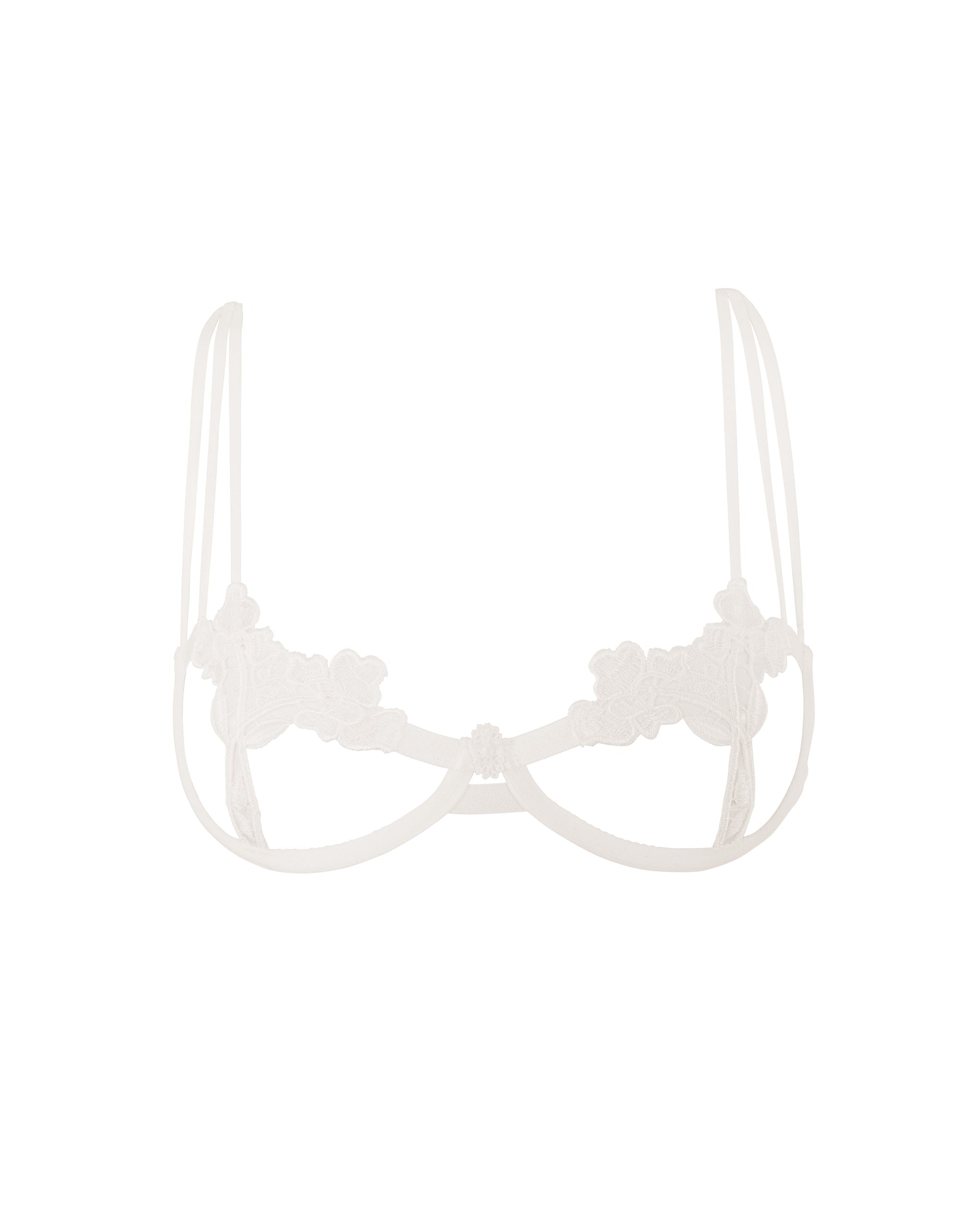 This provocative and chic bra features guipure lace that contrasts with sheer mesh on the cups, creating a bold open design. Slimline triple shoulder straps add a delicate feel, while central diamante detailing provides a touch of opulence. The piece is underwired for lift and support, with partly adjustable shoulder straps and a hook-and-eye clasp for your ideal fit.