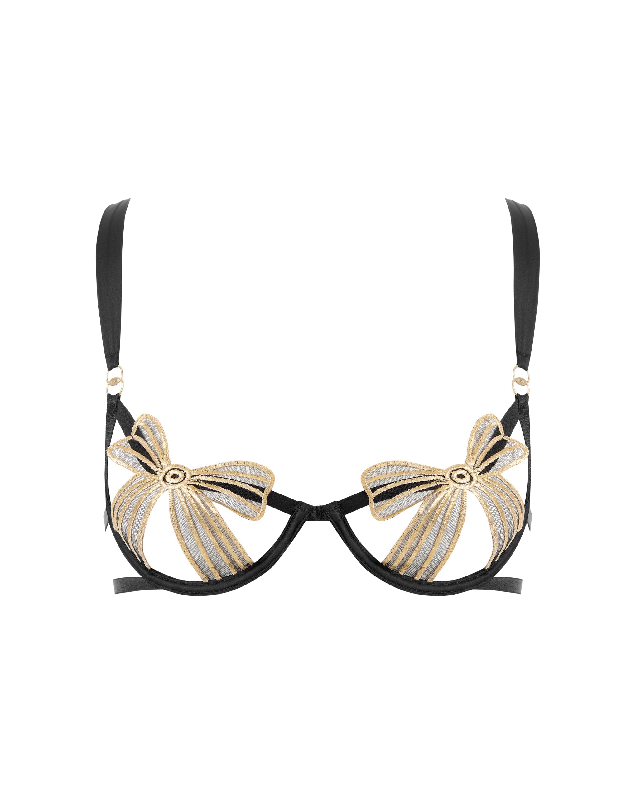 Crafted from a mix of sheer mesh and satin strapping with a delicate gold-finished bow, this semi-open bra features adjustable straps and rear hook-and-eye fastenings for a beautifully tailored fit. It is part of a lower-impact range offering extended sizes.