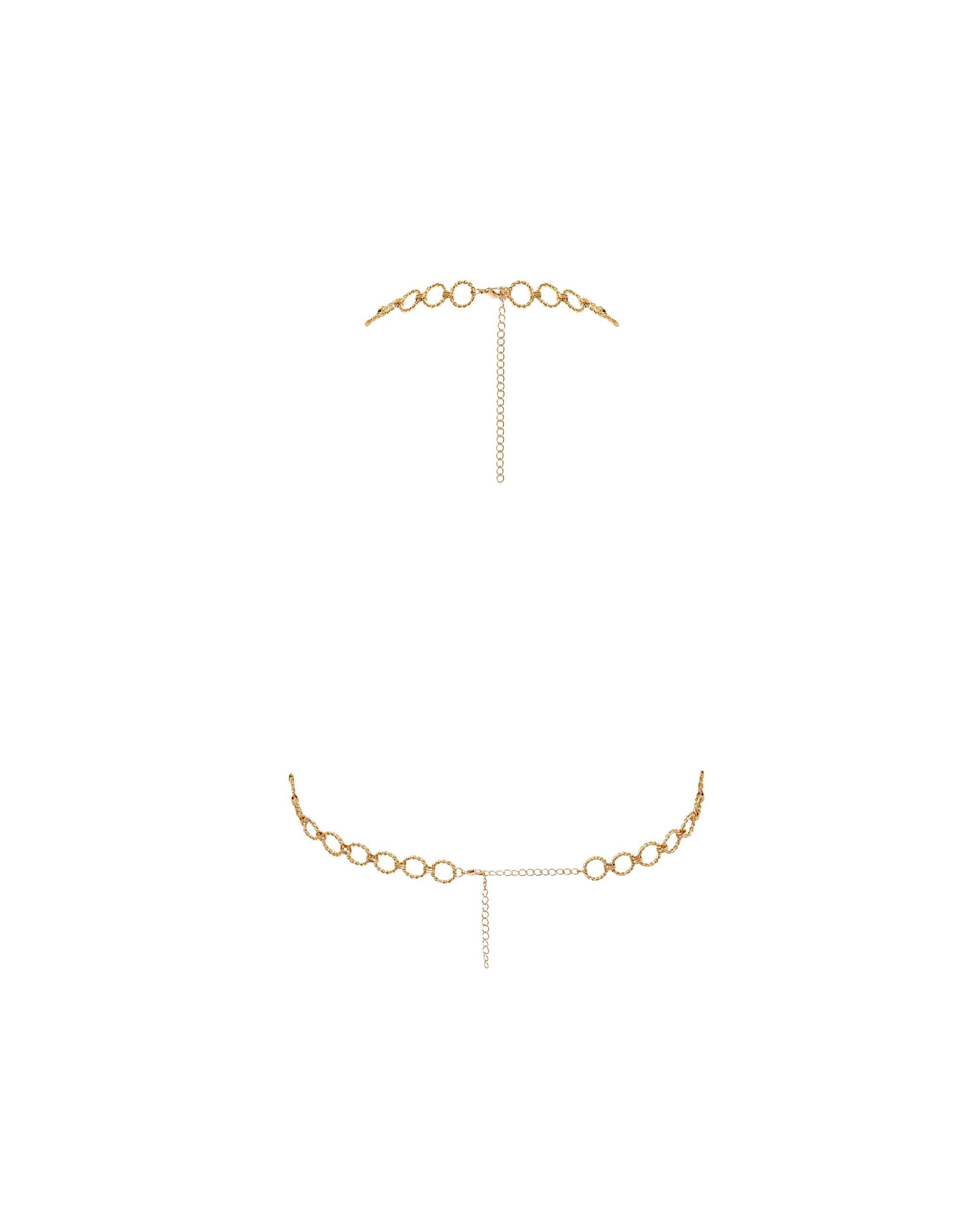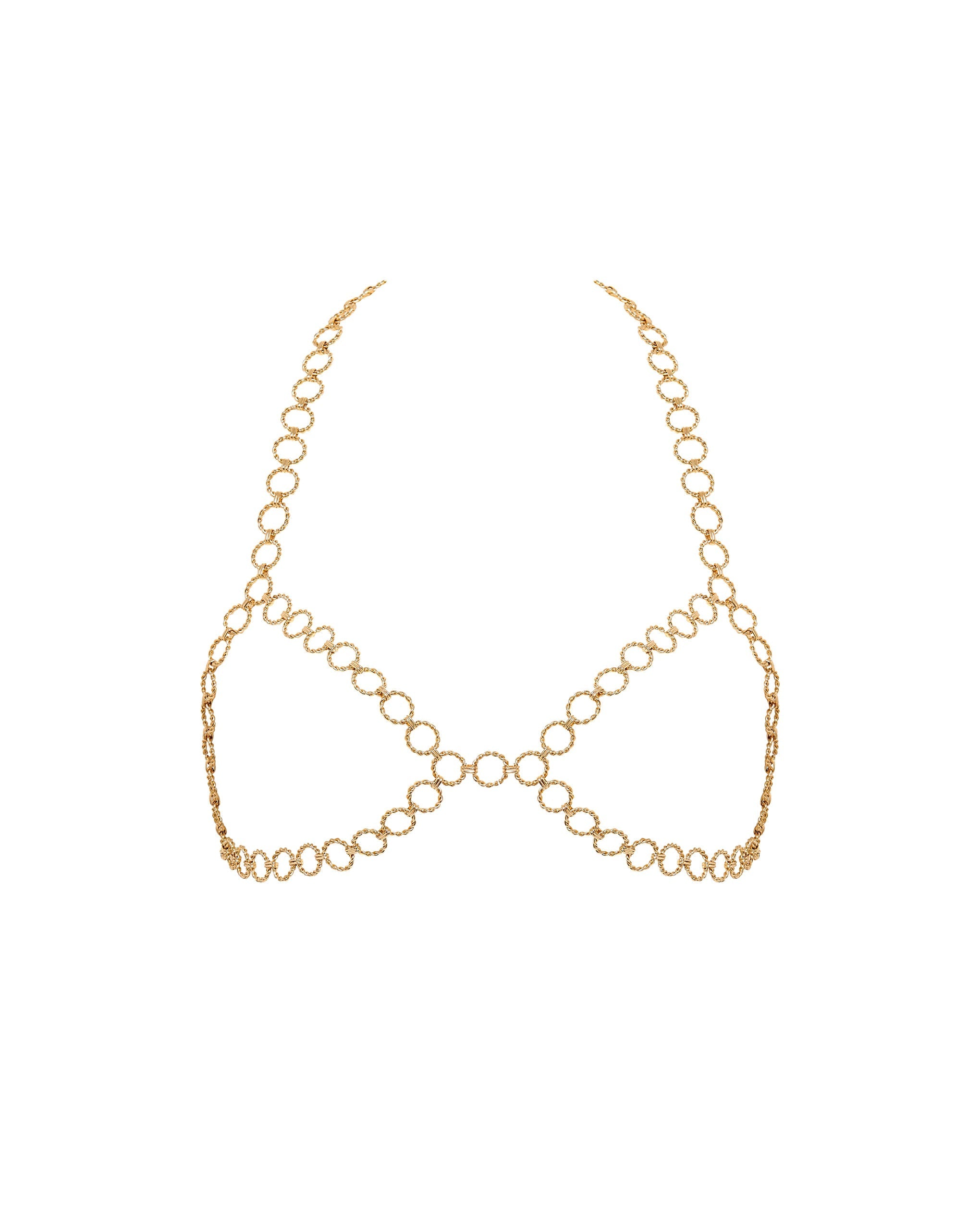 This open triangle design features a captivating chain construction that decorates the décolletage, adding a touch of sensuality. The piece can be styled as an accessory layered over clothing or worn as lingerie with matching pieces.