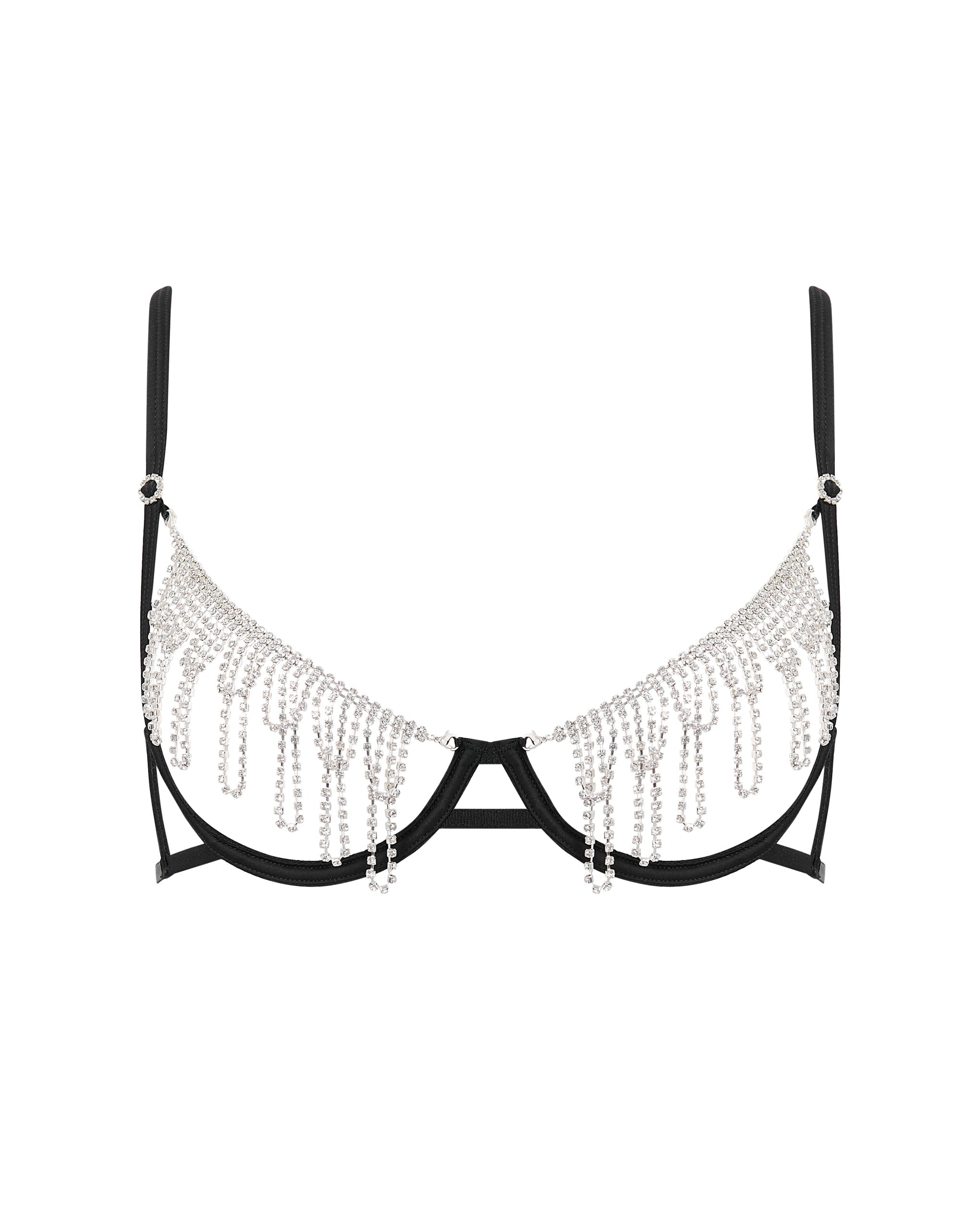 It features open cups adorned with draped diamante chains that catch the light with every movement, underwired for subtle structure, with adjustable shoulder straps and a rear fastening.