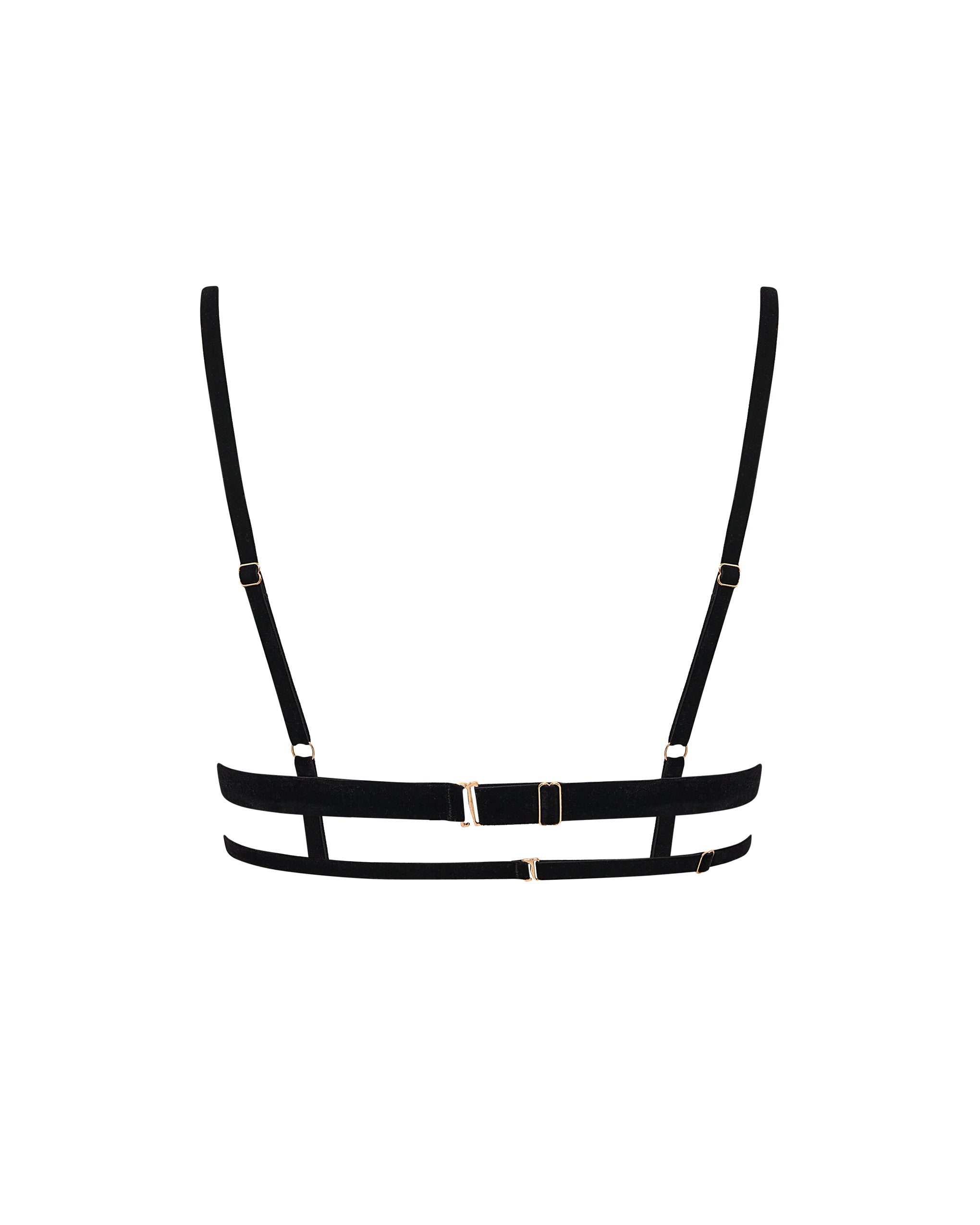 This piece is a hybrid of a bralette and a harness, featuring non-wired construction with adjustable straps and a hook-and-eye fastening for a customizable fit.