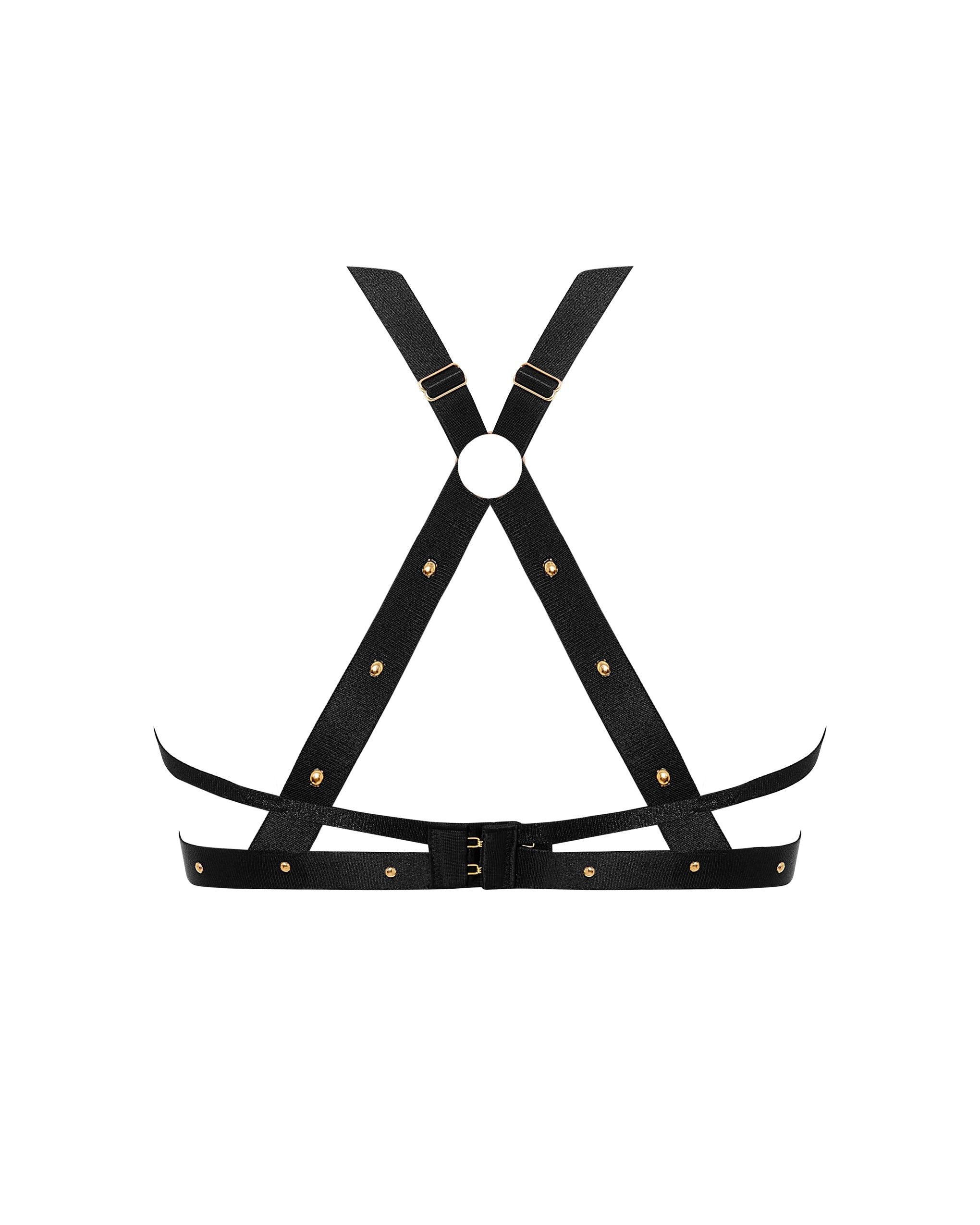 The harness bra design features underwiring and a raised center gore for support and subtle lift, while the premium elastic strapping is adorned with gold-tone studs and ring hardware for a striking look. Adjustable cross-back straps and a rear hook and eye fastening ensure a personalized and secure fit.