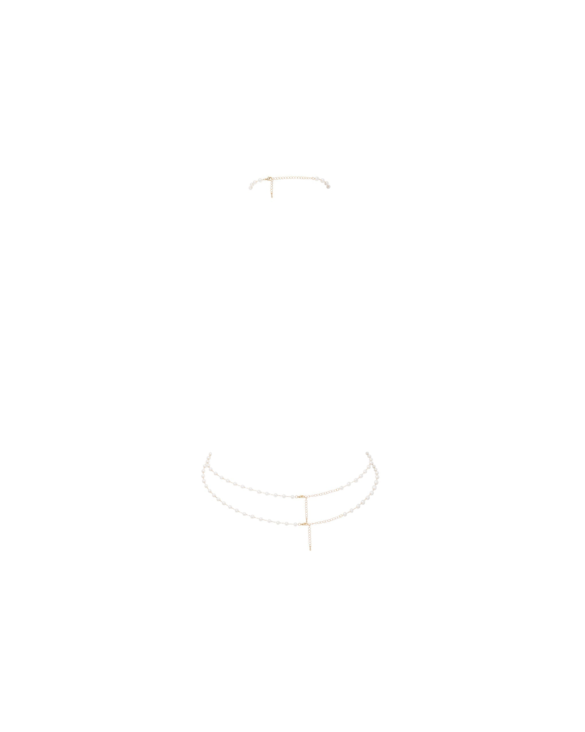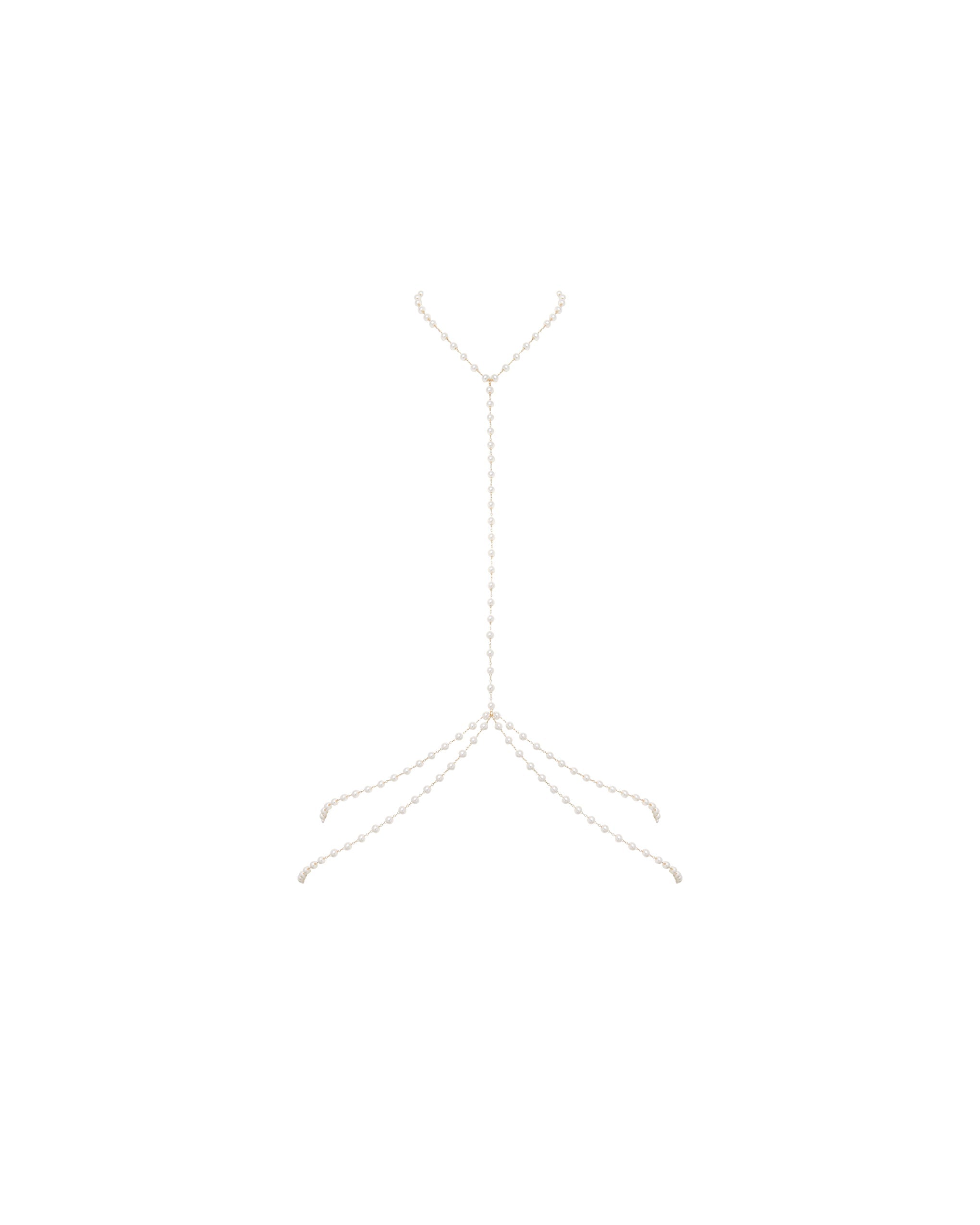 This unique piece blends jewelry with lingerie, featuring cascading pearlescent beads and delicate golden chains that drape from the neck down the chest to gently caress the waist and hips.