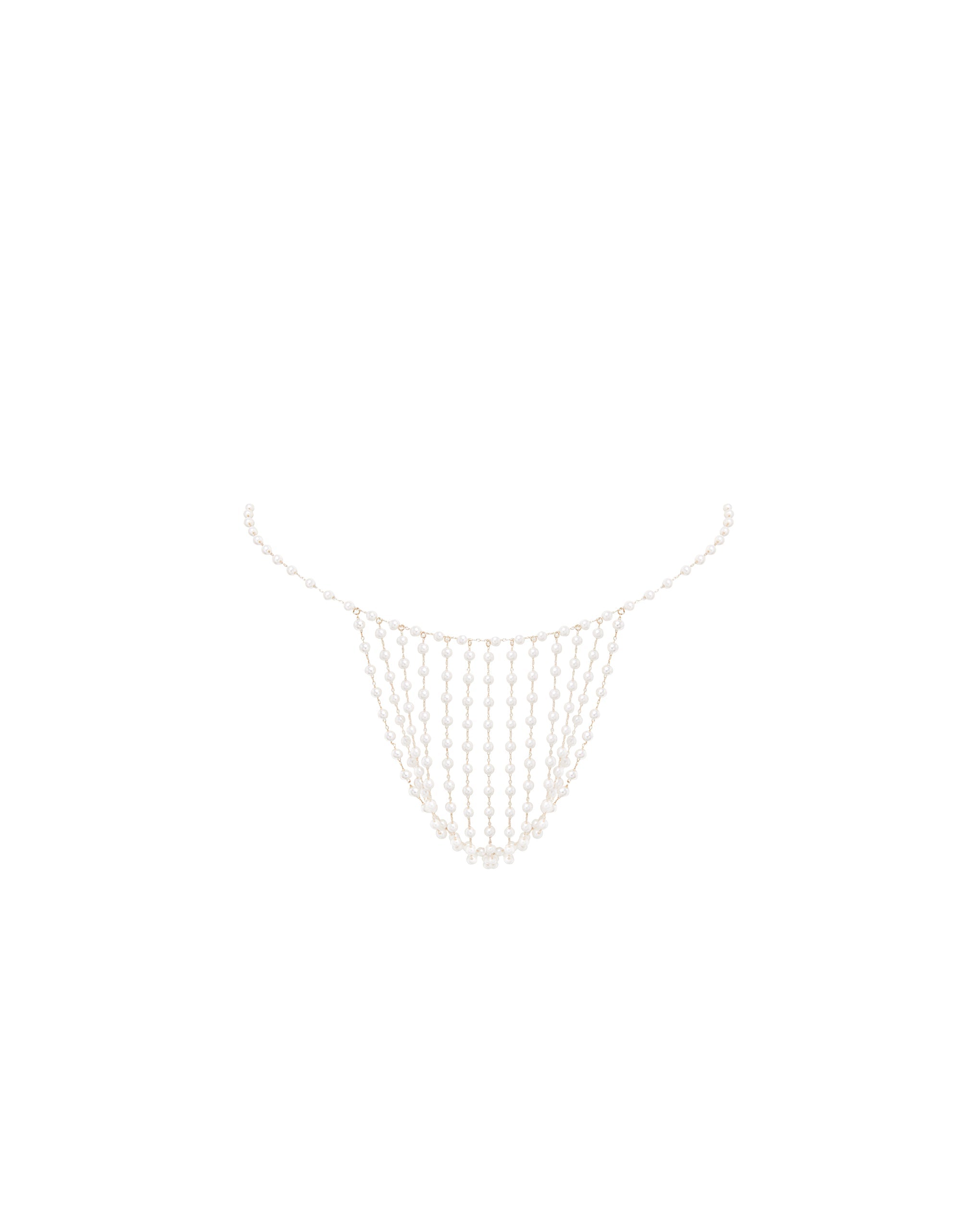 This piece features lustrous pearlescent beads and delicate gold-tone chains in a minimalist G-string design.