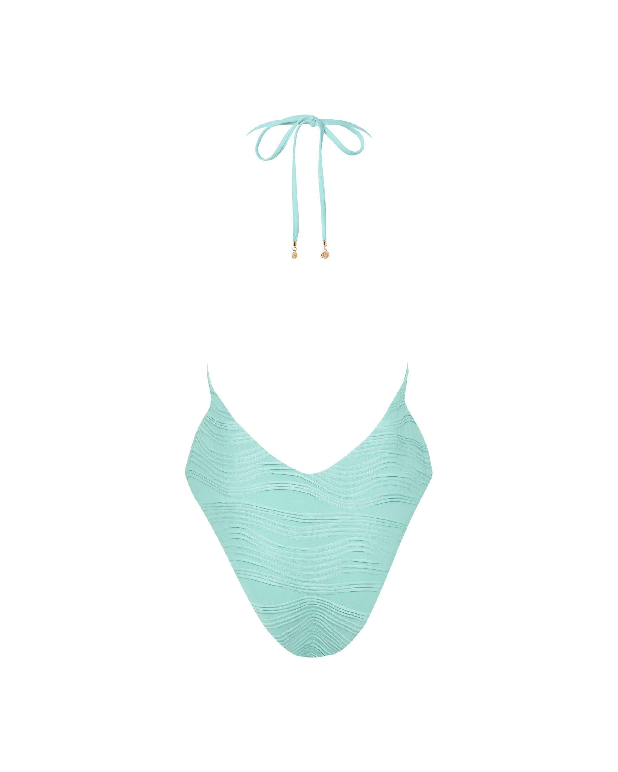 This swimsuit features a distinctive wave-textured fabric in a stunning island blue, accented with delicate gold embellishments along the plunging neckline and halterneck straps. The artfully designed open back and high-rise cheeky cut work together to create a confident, beach-ready silhouette that celebrates your shape.