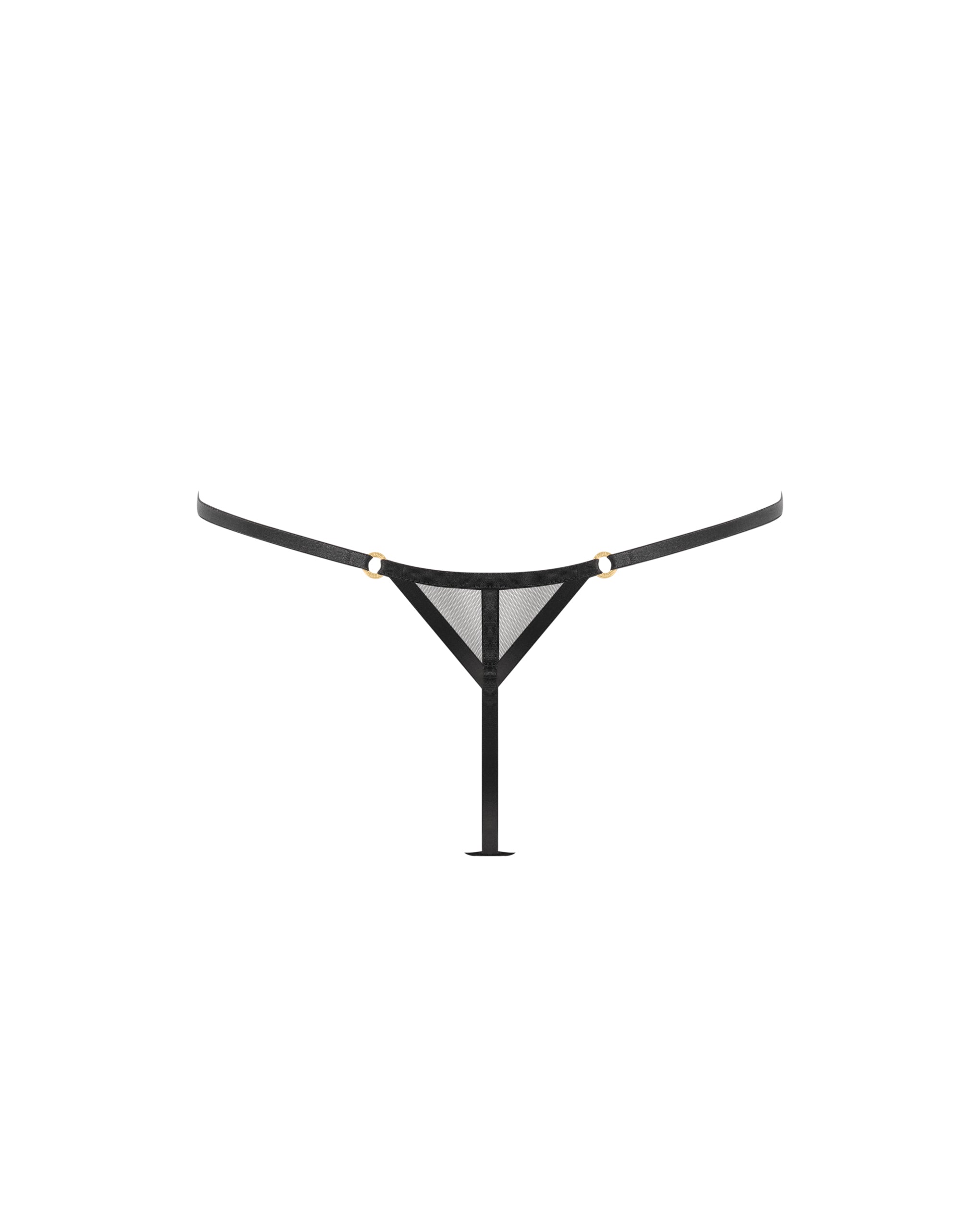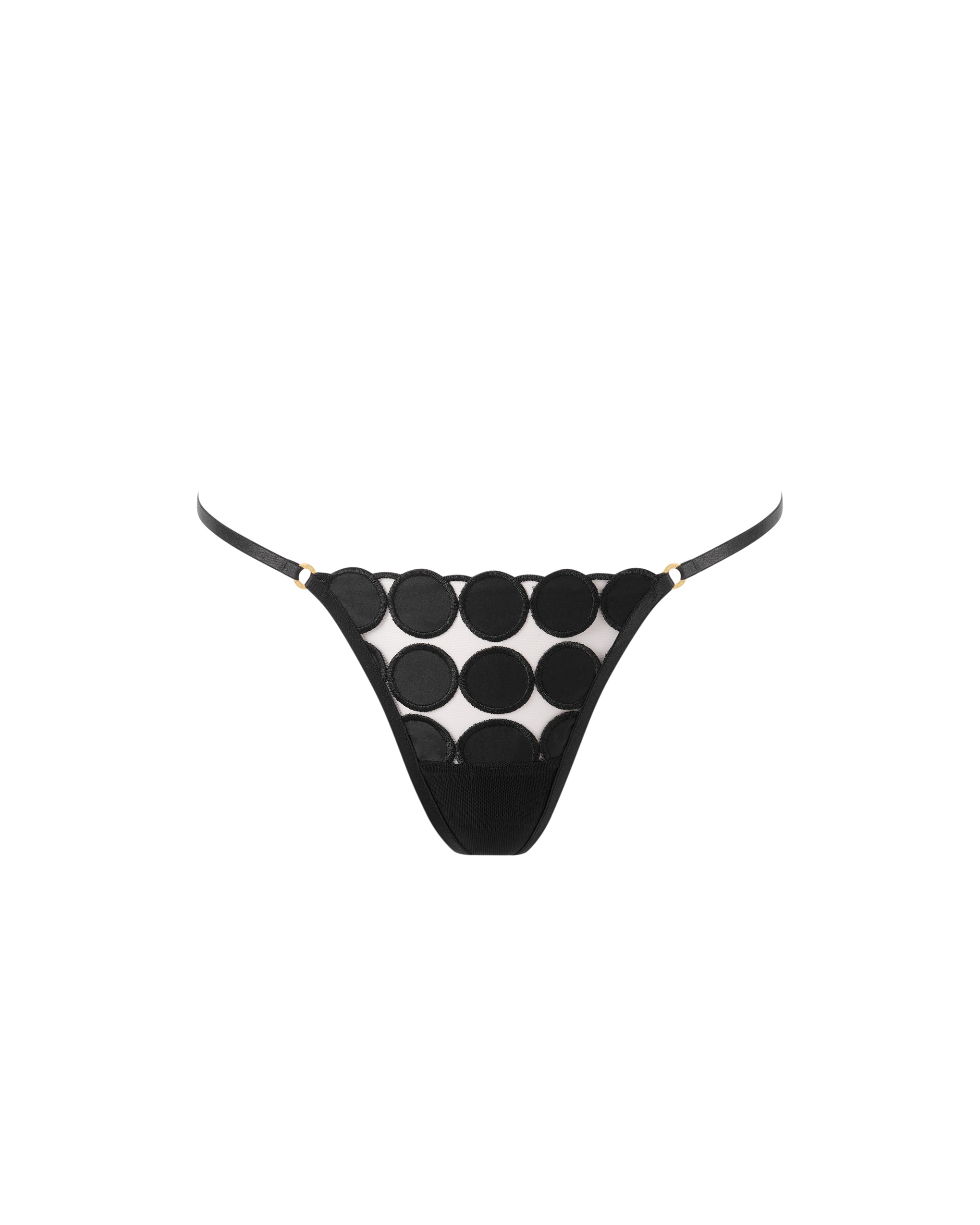Crafted from sheer, lightweight mesh adorned with playful satin polka dots, this thong features a delicate G-string silhouette with a rear triangle keyhole for a smooth, minimal finish that disappears under clothing.