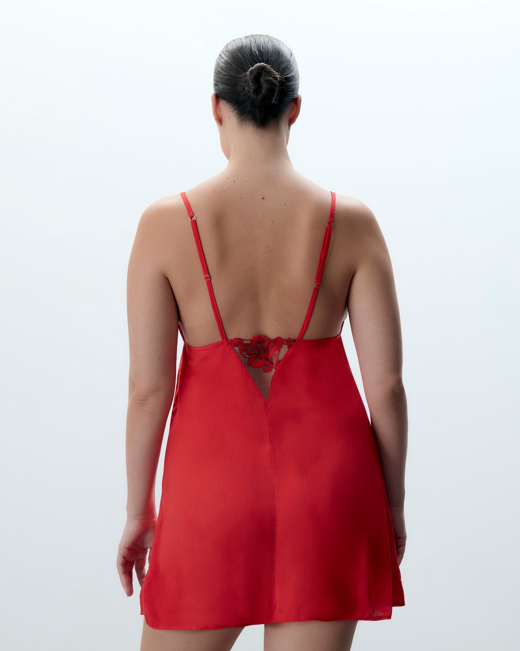 This romantic chemise is crafted from fluid bias-cut satin for a graceful, flattering drape that moves with you. The sheer mesh insert at the chest is adorned with stunning bespoke floral embroidery, framed by a plunging neckline and open back for a touch of dramatic allure.
