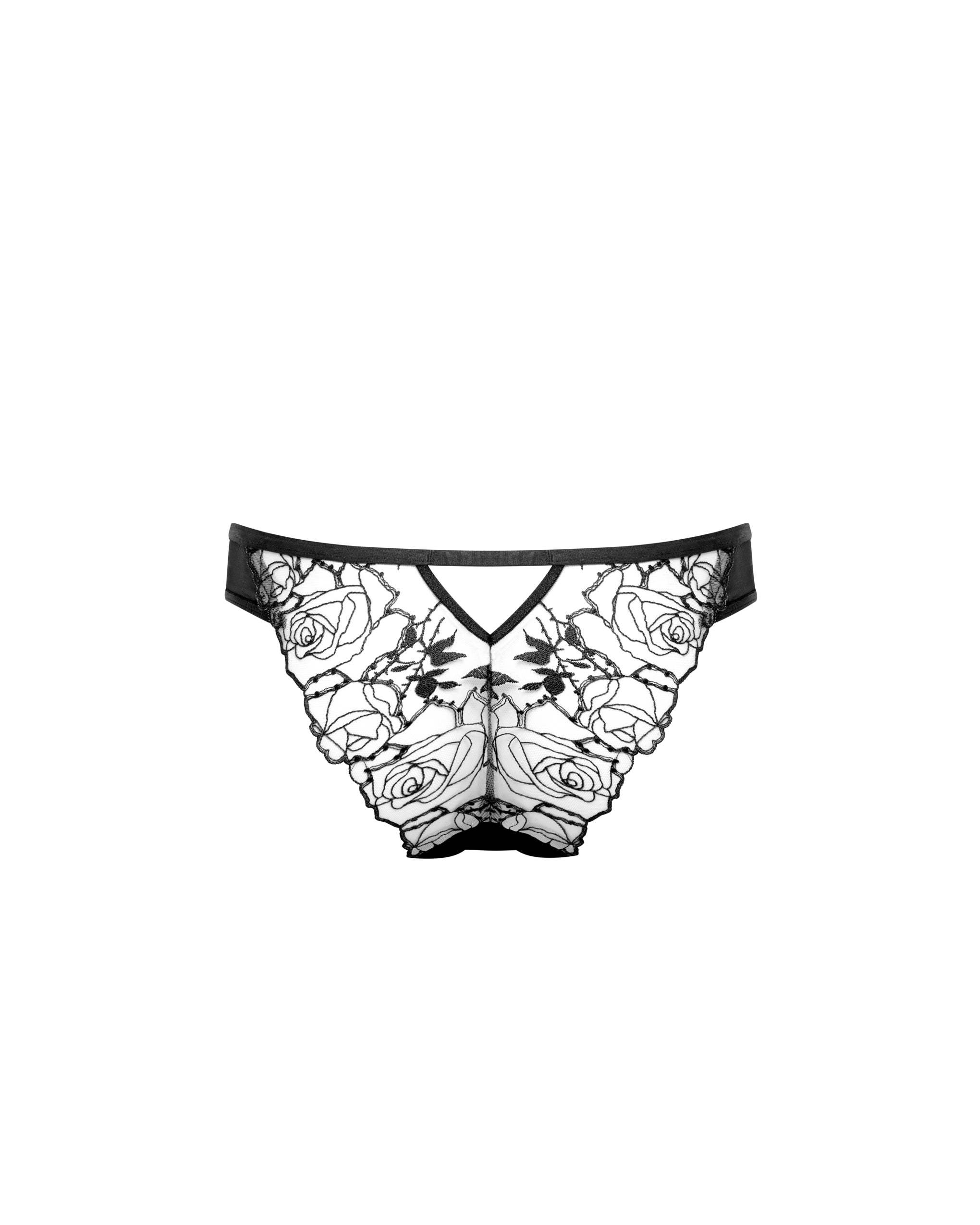 This piece features intricate rose and vine leaf embroidery, a keyhole detail to the rear, and wide-set side straps for a flattering silhouette. The gentle, hypoallergenic bamboo gusset offers added comfort and security throughout wear.