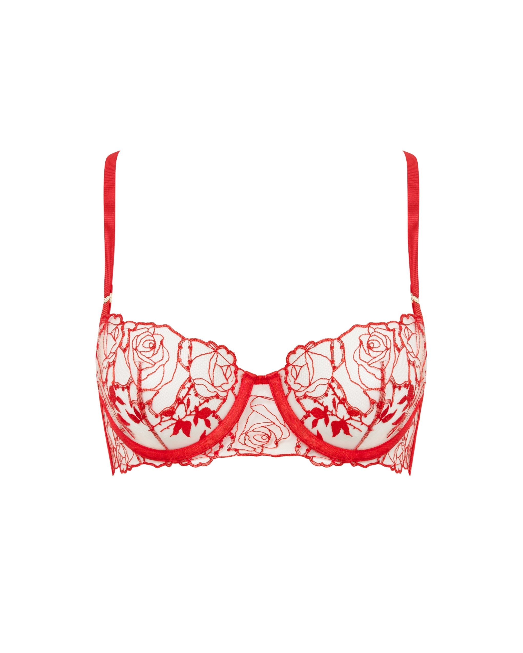 This lingerie masterpiece features intricate rose and vine leaf embroidery atop a signature premium sheer mesh that details the cups and underband of this demi bra. Underwiring, adjustable shoulder straps, and a rear hook-and-eye fastening ensure a secure and tailored fit.