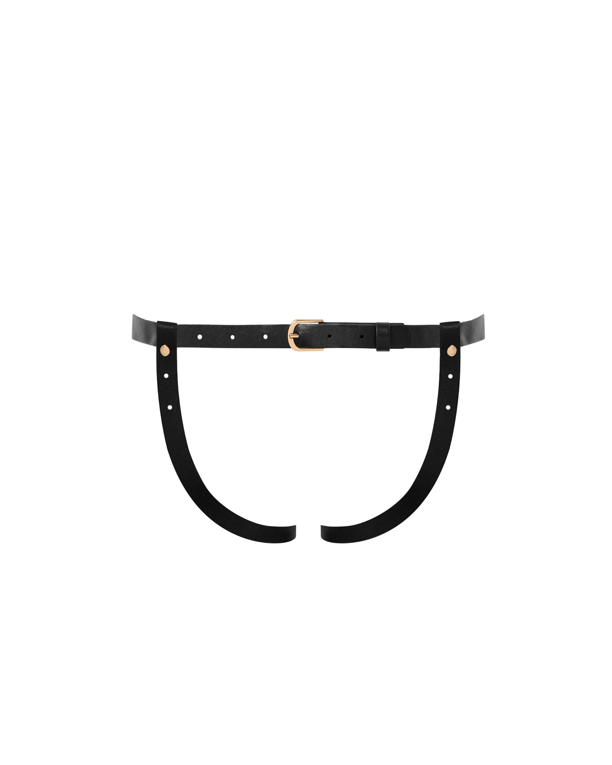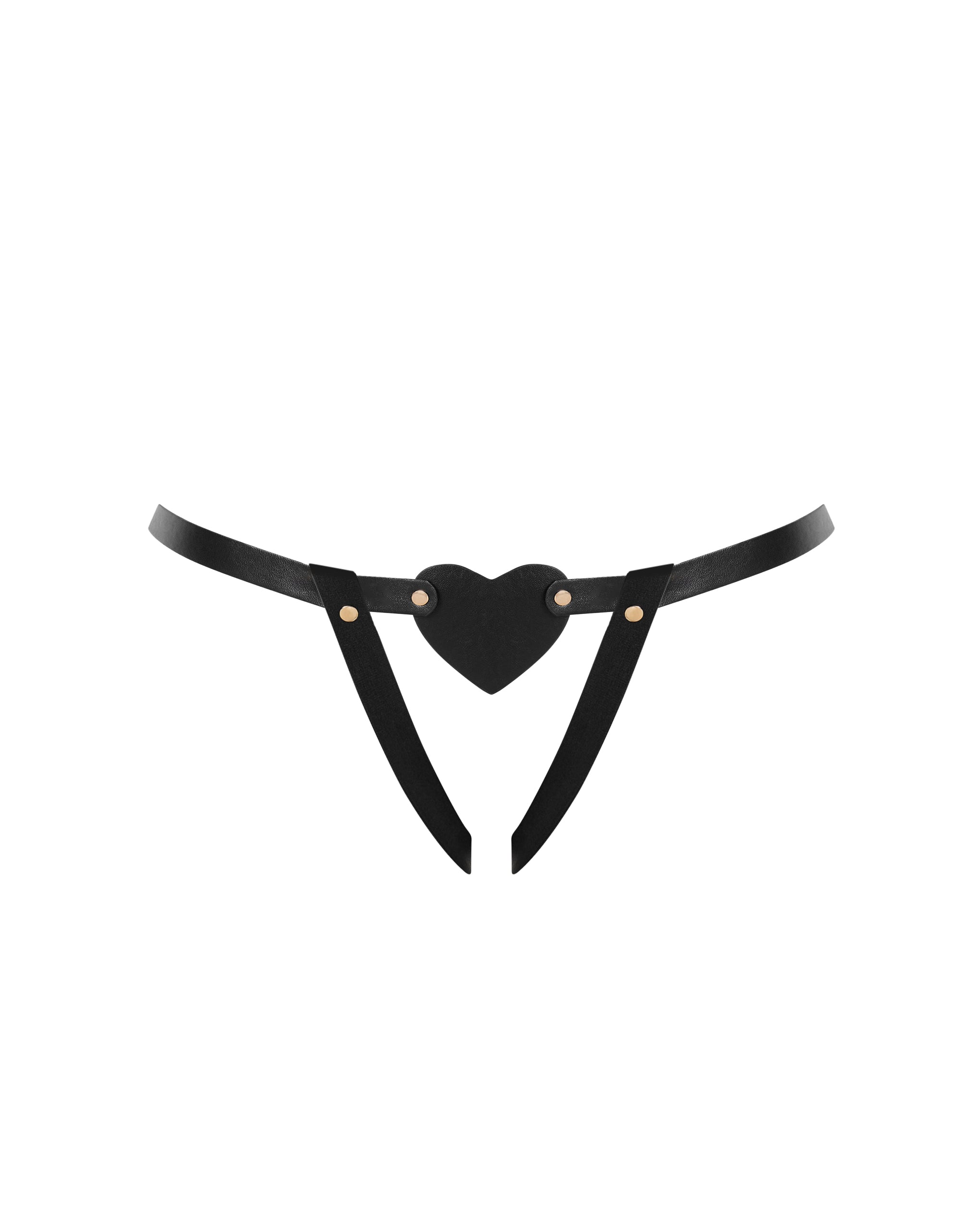 This open panty features a striking leather-look silhouette with gold hardware and a statement heart detail, crafted from polyurethane with zinc alloy accents for a secure and adjustable fit.