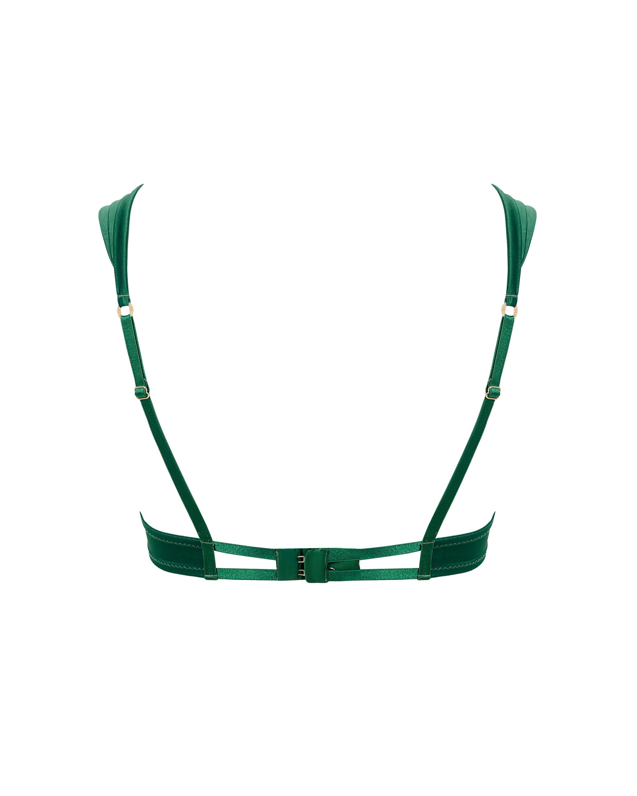 Crafted from luxurious deep green satin with beautifully molded heart-shaped demi cups and refined winged strap detailing for a tailored, contemporary fit.