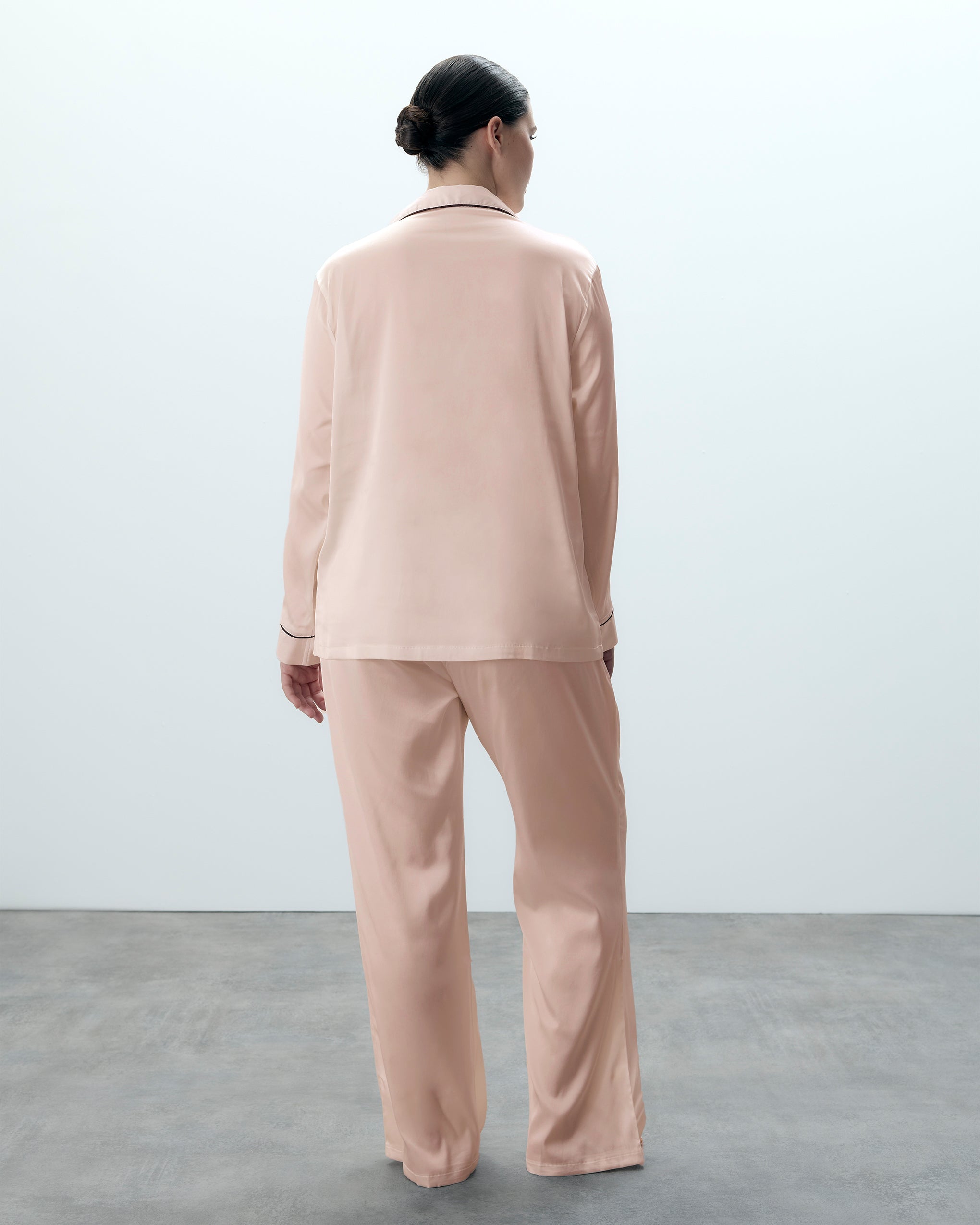 Layer the button-down shirt over the trousers for a polished lounge look, or wear the set as intended for restful sleep. The satin fabric and timeless design make it feel special, even at home.