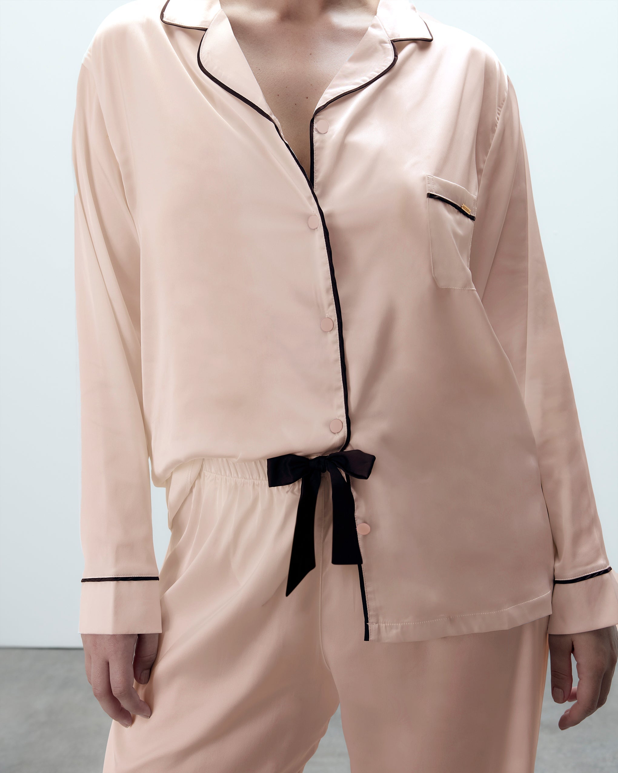 This classic pajama set features a soft pink satin shirt with black piping along the collar, cuffs, and pocket, paired with relaxed wide-leg trousers finished with a statement black satin bow at the waist. The elasticated waistband and loose fit are crafted for ultimate comfort.