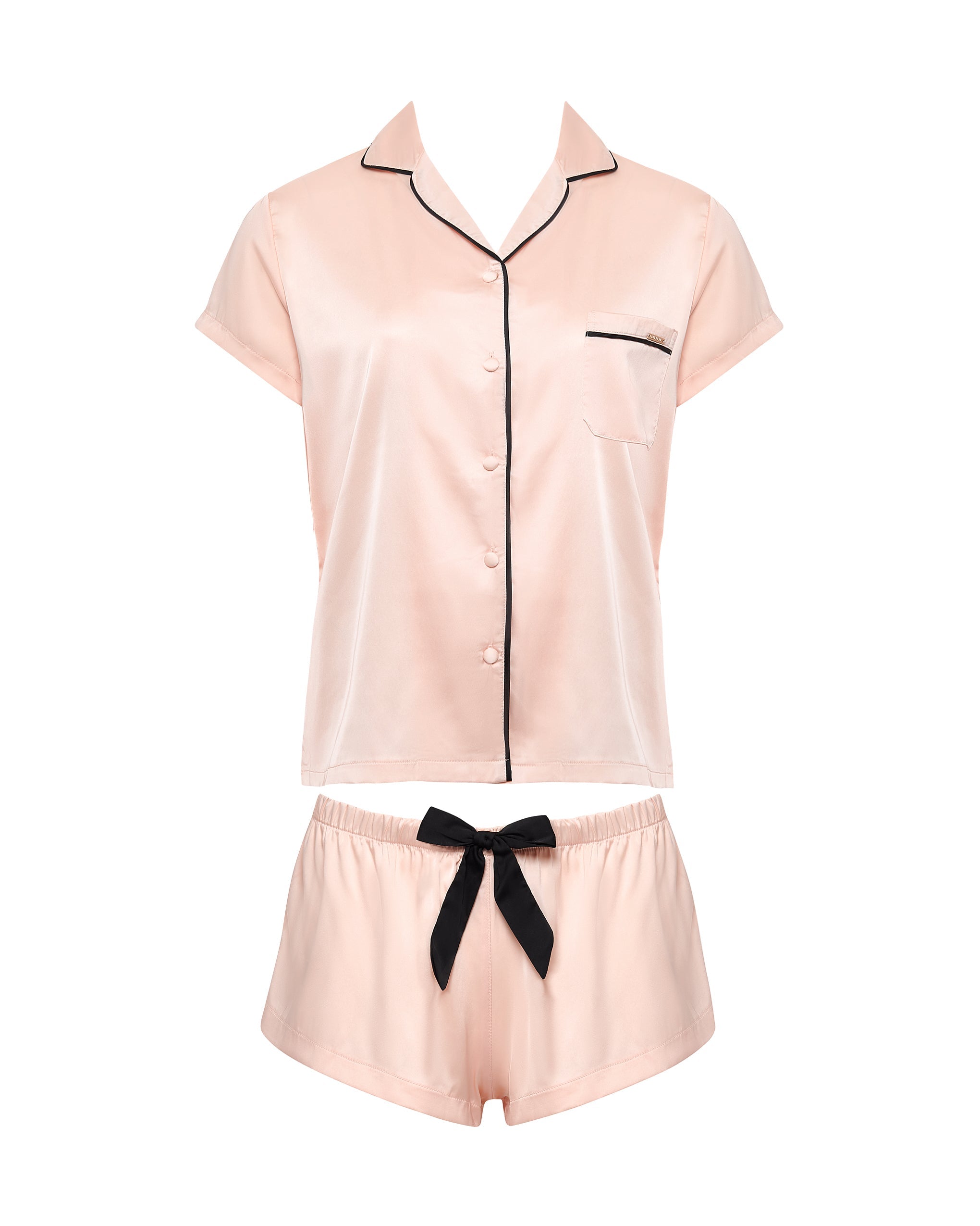 This timeless pajama set features soft, cool-to-the-touch satin, a shirt with delicate contrast piping and a small appliqué pocket, and shorts with an elasticated waistband finished with a striking black satin bow for a modern classic look.
