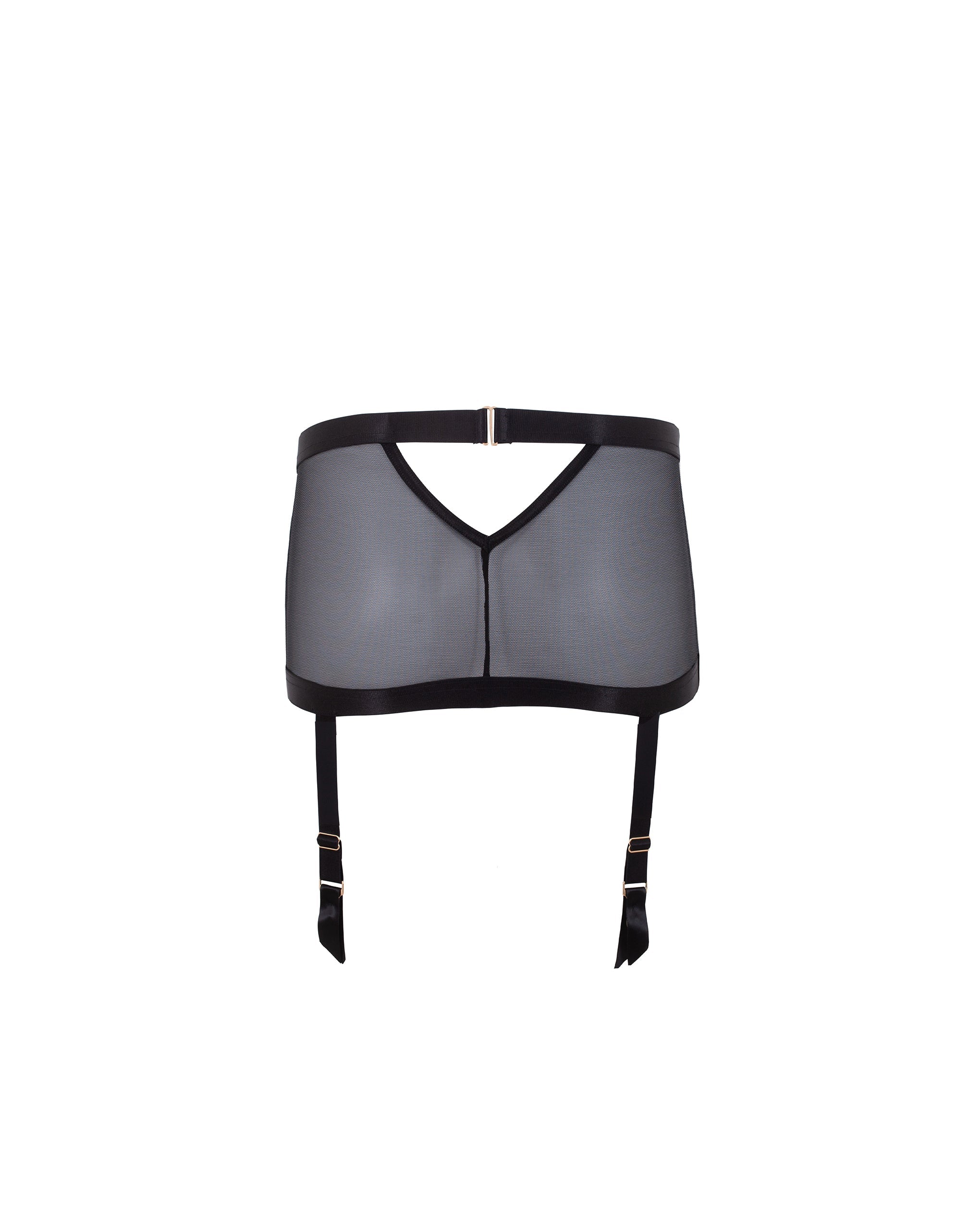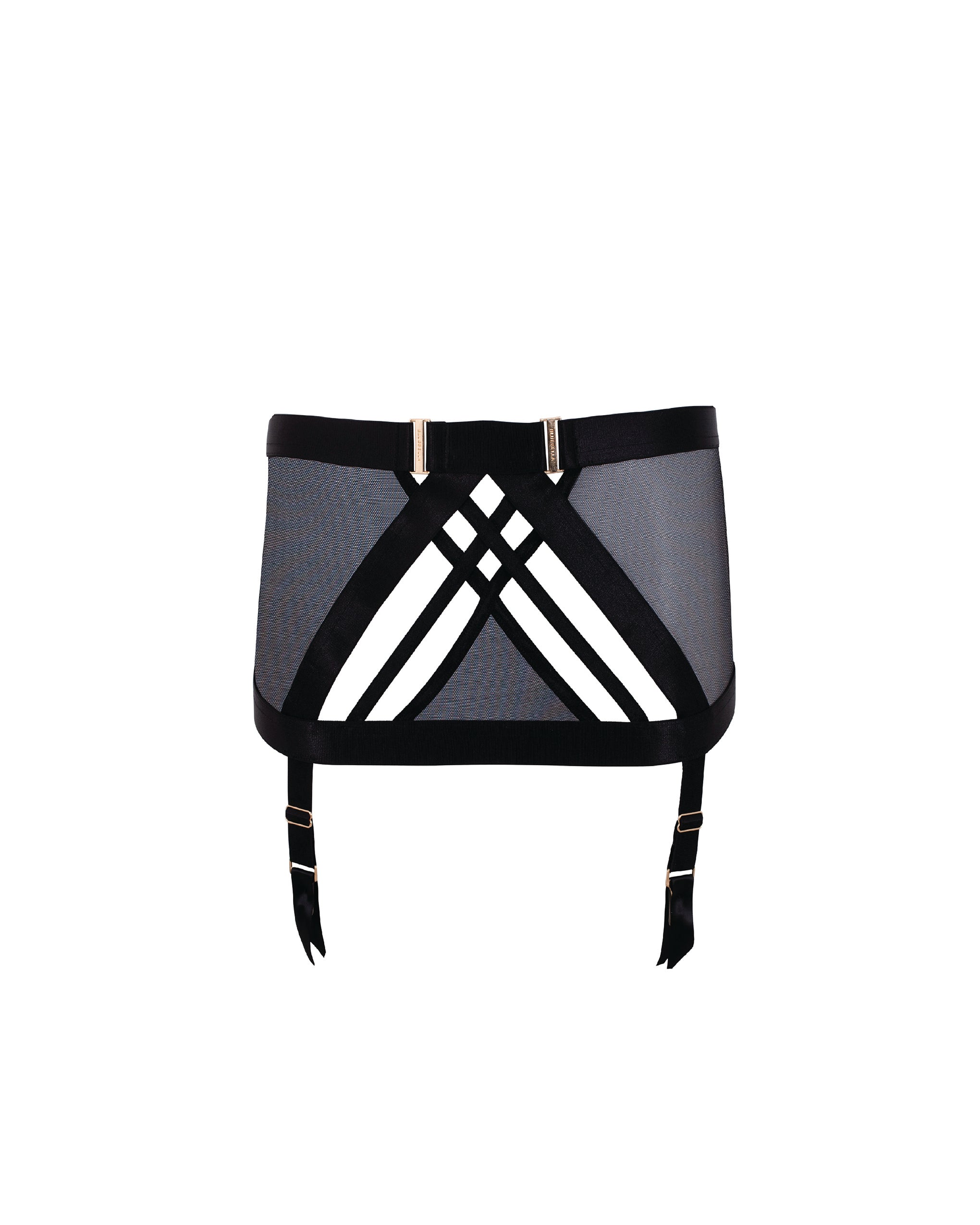 This chic and sculptural piece features sheer mesh that sits soft against the skin, with wide bands of elastic creating dramatic lines and provocative cut-outs. Gold-tone detailing adds a touch of opulence, while the waistband secures with a swan neck clasp for a close, elasticated fit.