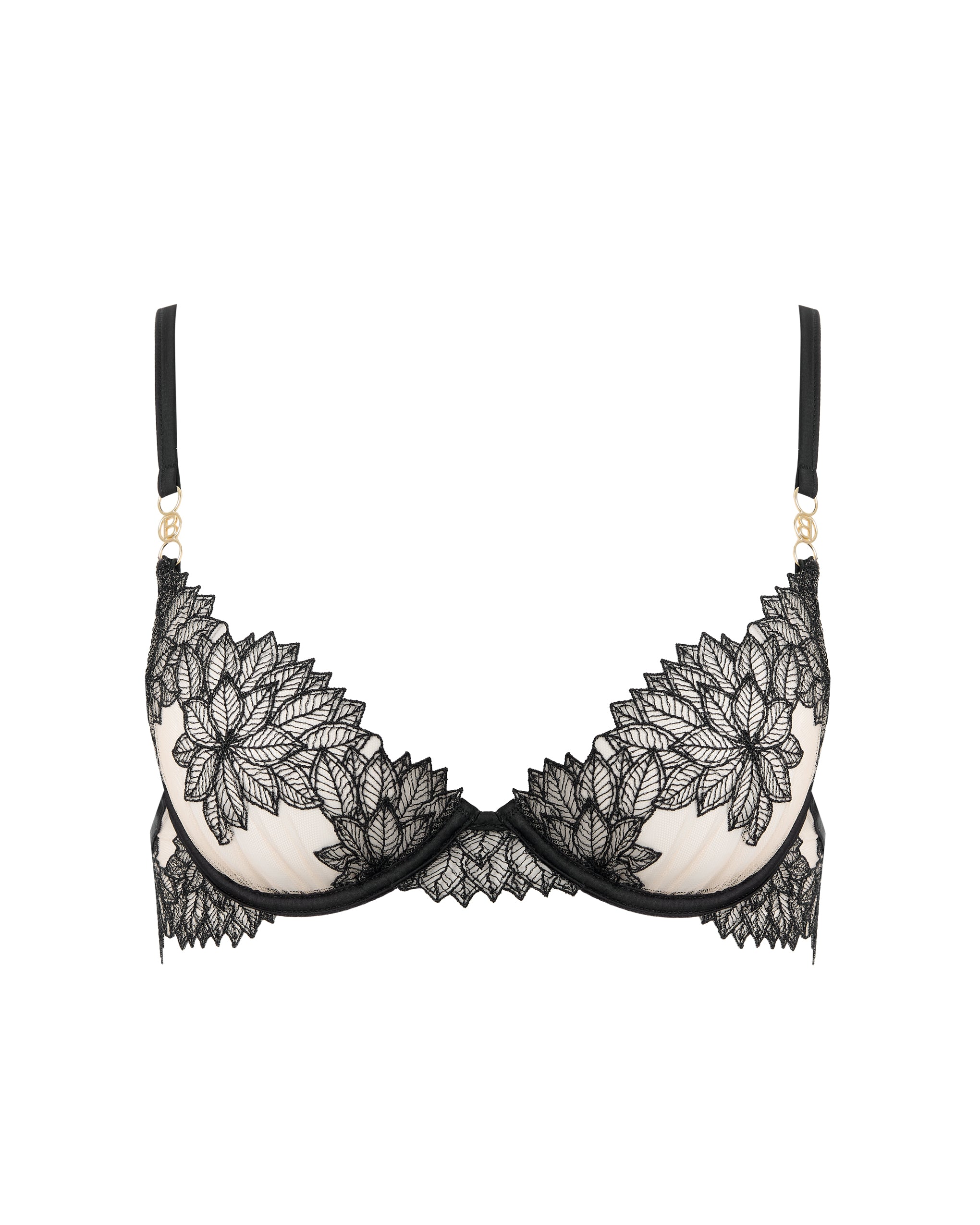 The sheer mesh and overlapping floral lace embroidery create a delicate conceal and reveal effect across the demi cups, with details extending along the underband and sides, finished with underwire and adjustable straps for a personalized fit.