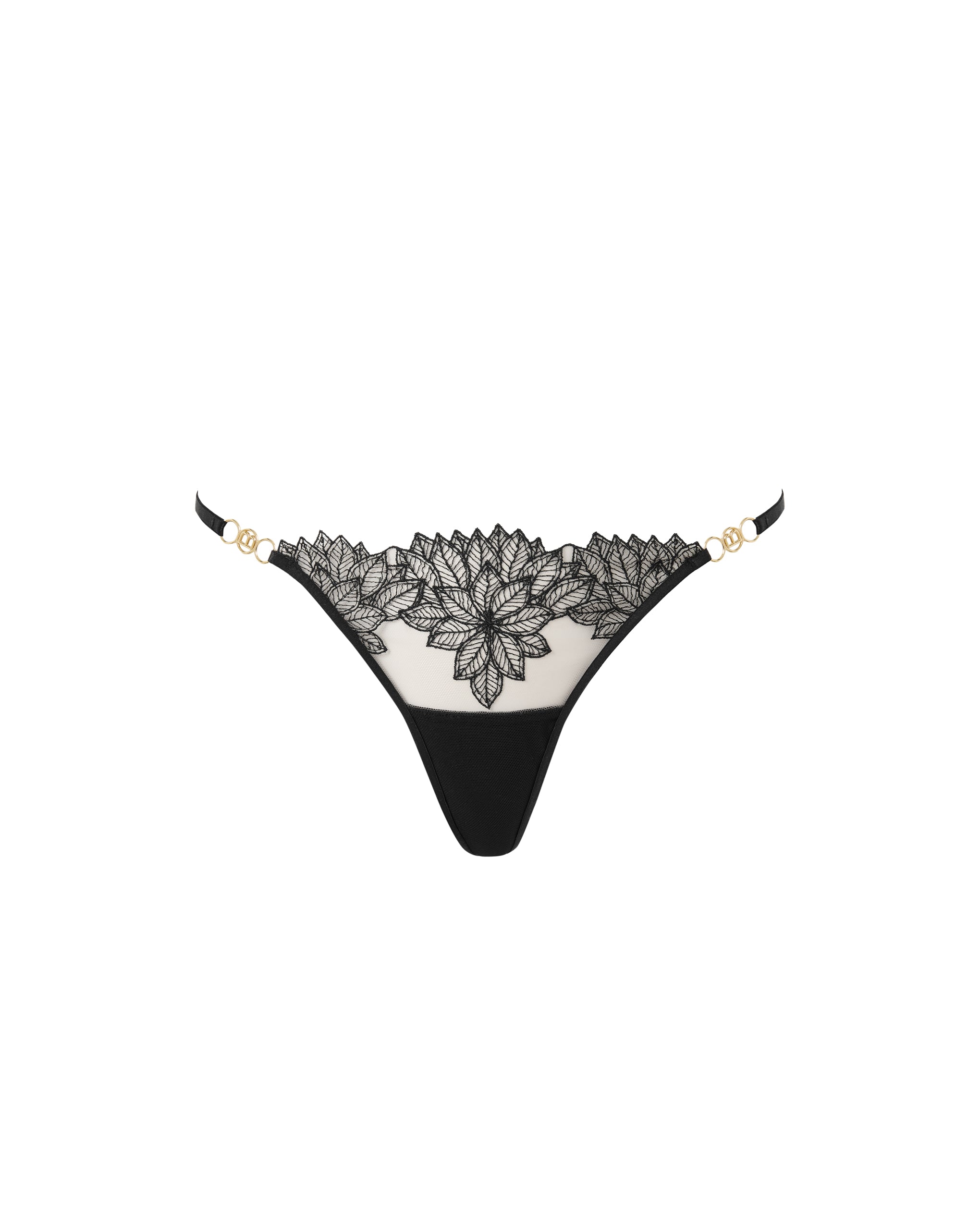 Featuring overlapping floral lace embroidery on a sheer mesh, with a delicate V-shaped detail at the back and a soft, hypoallergenic bamboo gusset for comfort.