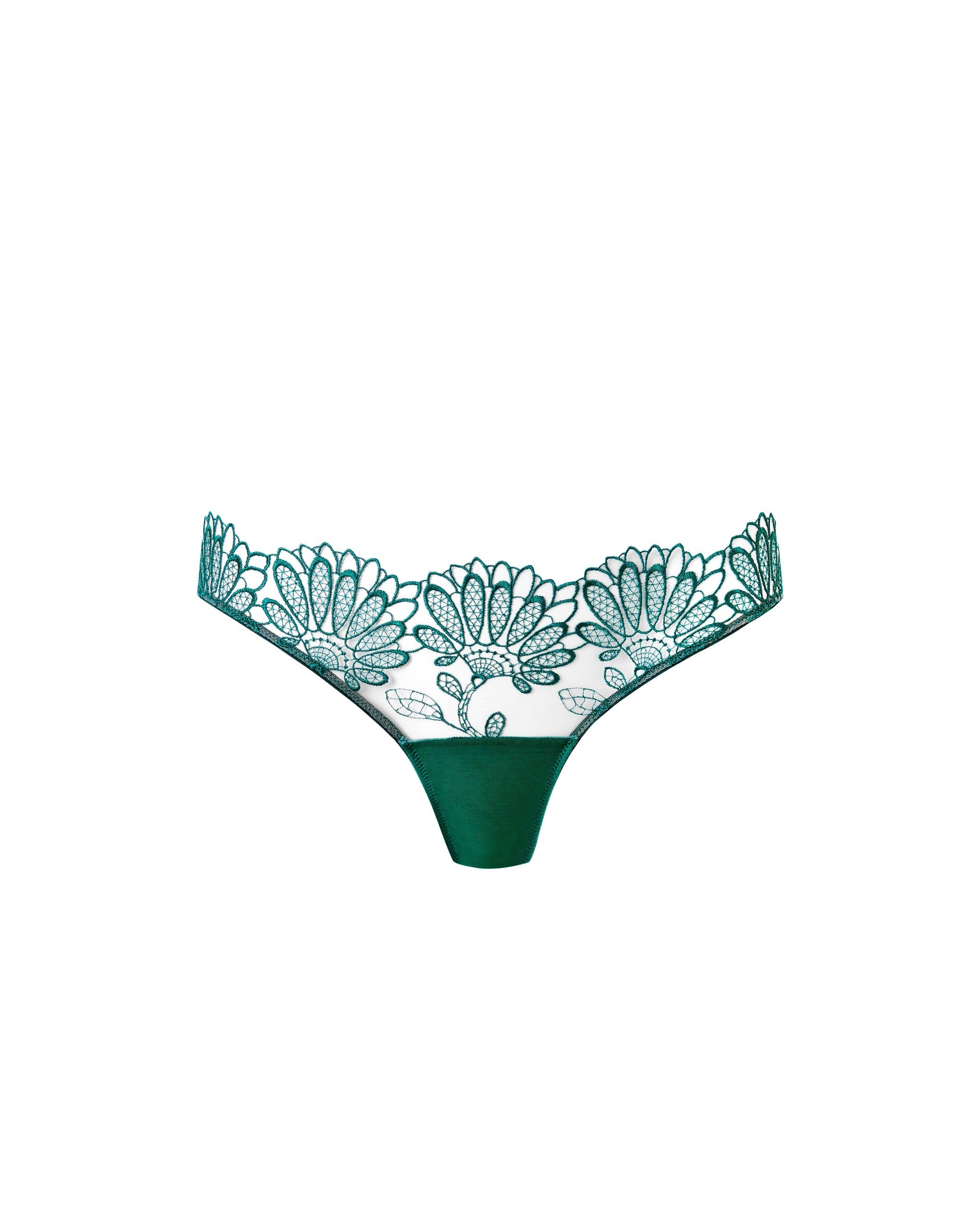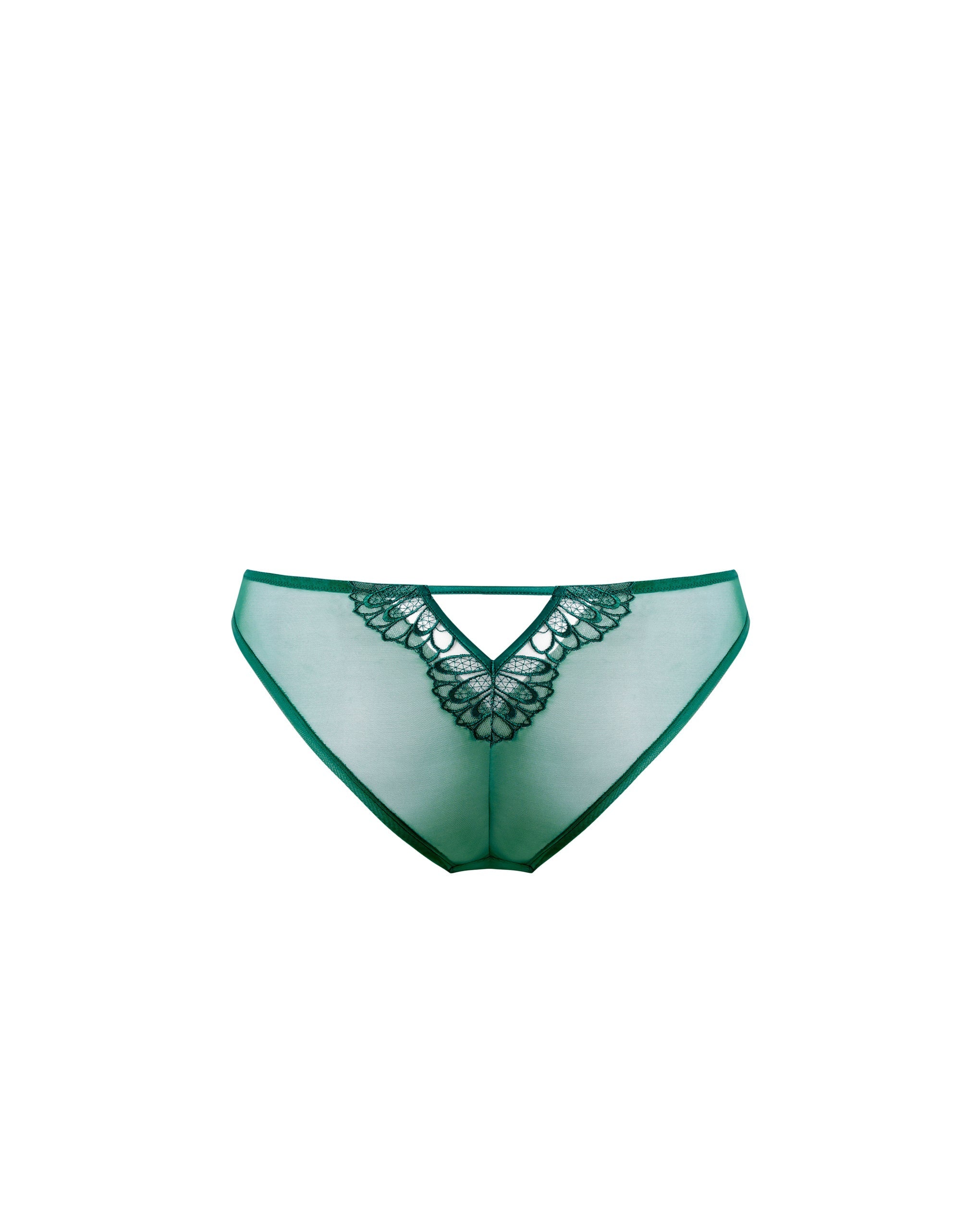 The panty features delicate botanical embroidery on sheer mesh with scalloped lace detailing, offering fuller coverage across the hips and rear for a flattering silhouette with a playful rear keyhole detail.