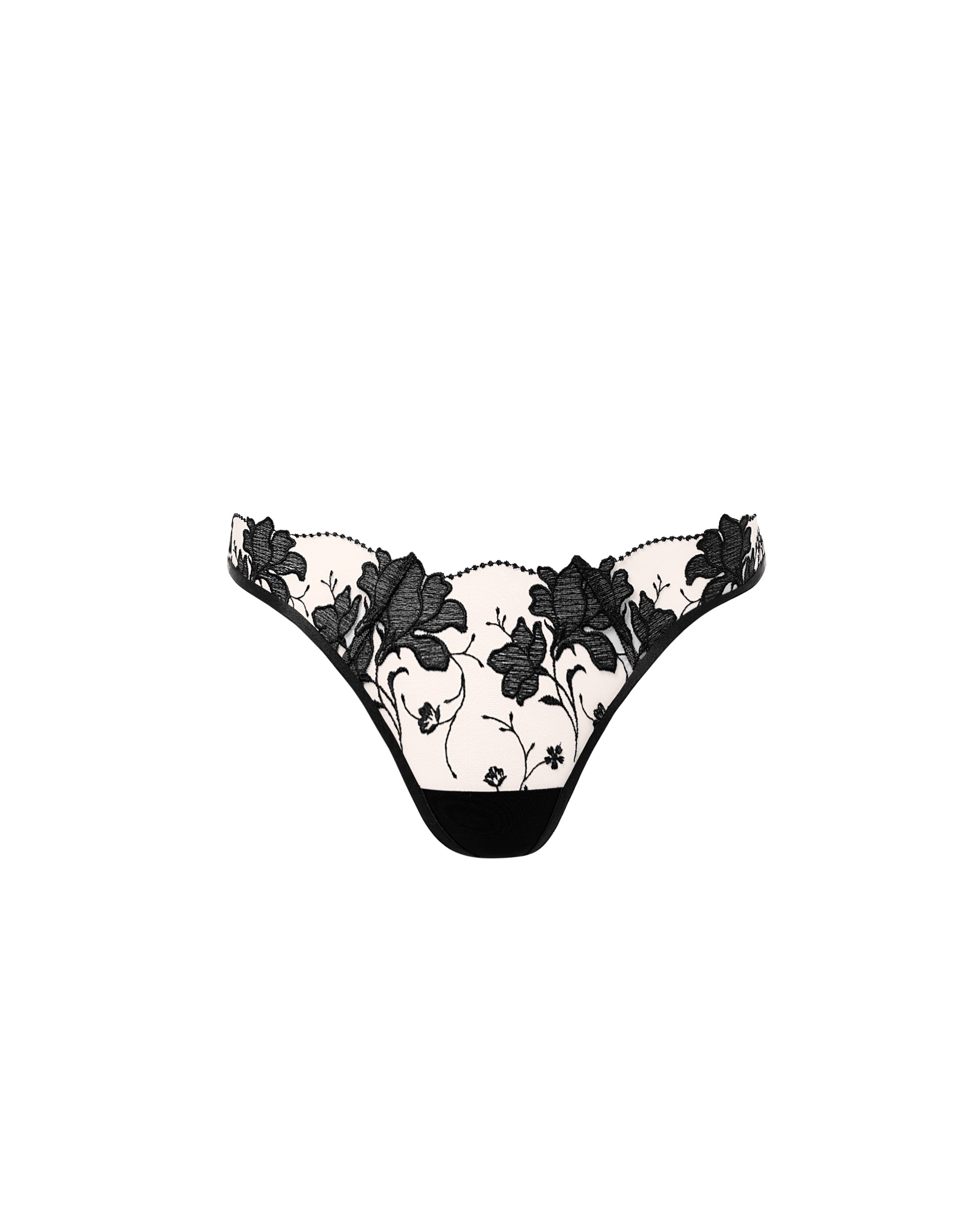 The Yvette Thong features a sheer mesh base adorned with artful floral embroidery and a delicate scalloped edge trim. Its G-string design offers a barely-there feel, while the bamboo gusset ensures comfort throughout wear.