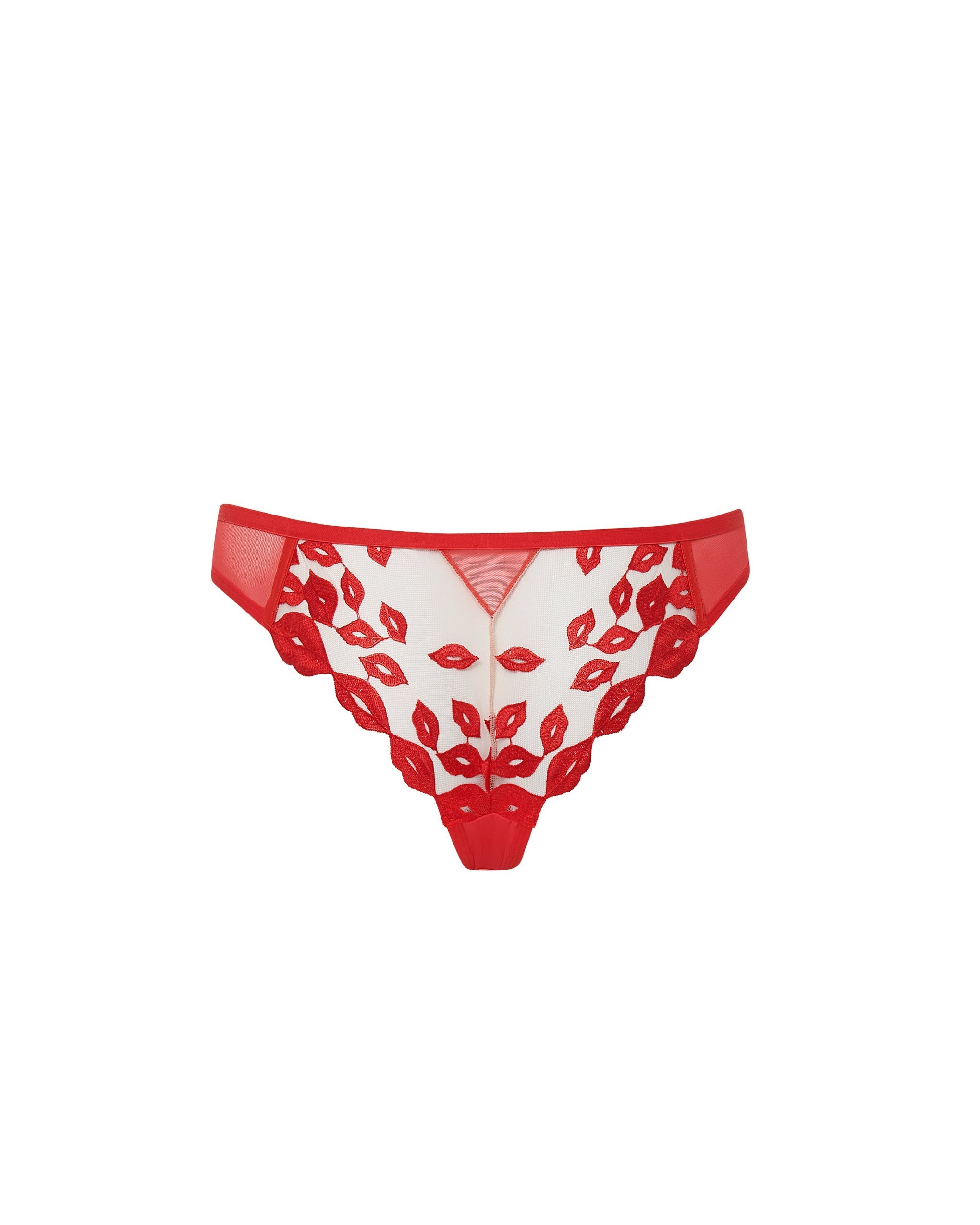 Crafted from sheer mesh with fiery red lip embroidery, featuring ultra-flattering wide-set side straps, a delicate keyhole detail, and a luxurious bamboo gusset for comfort.