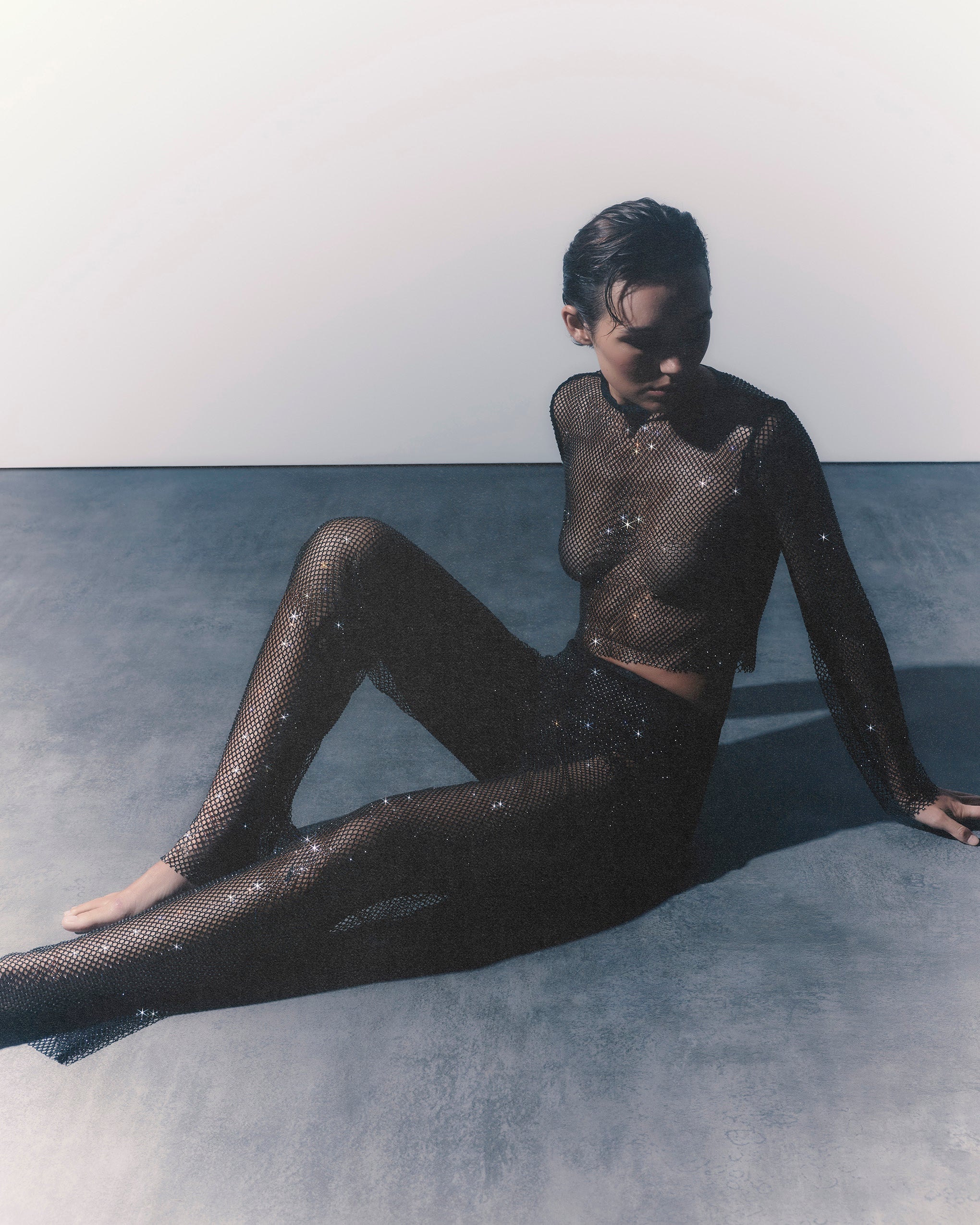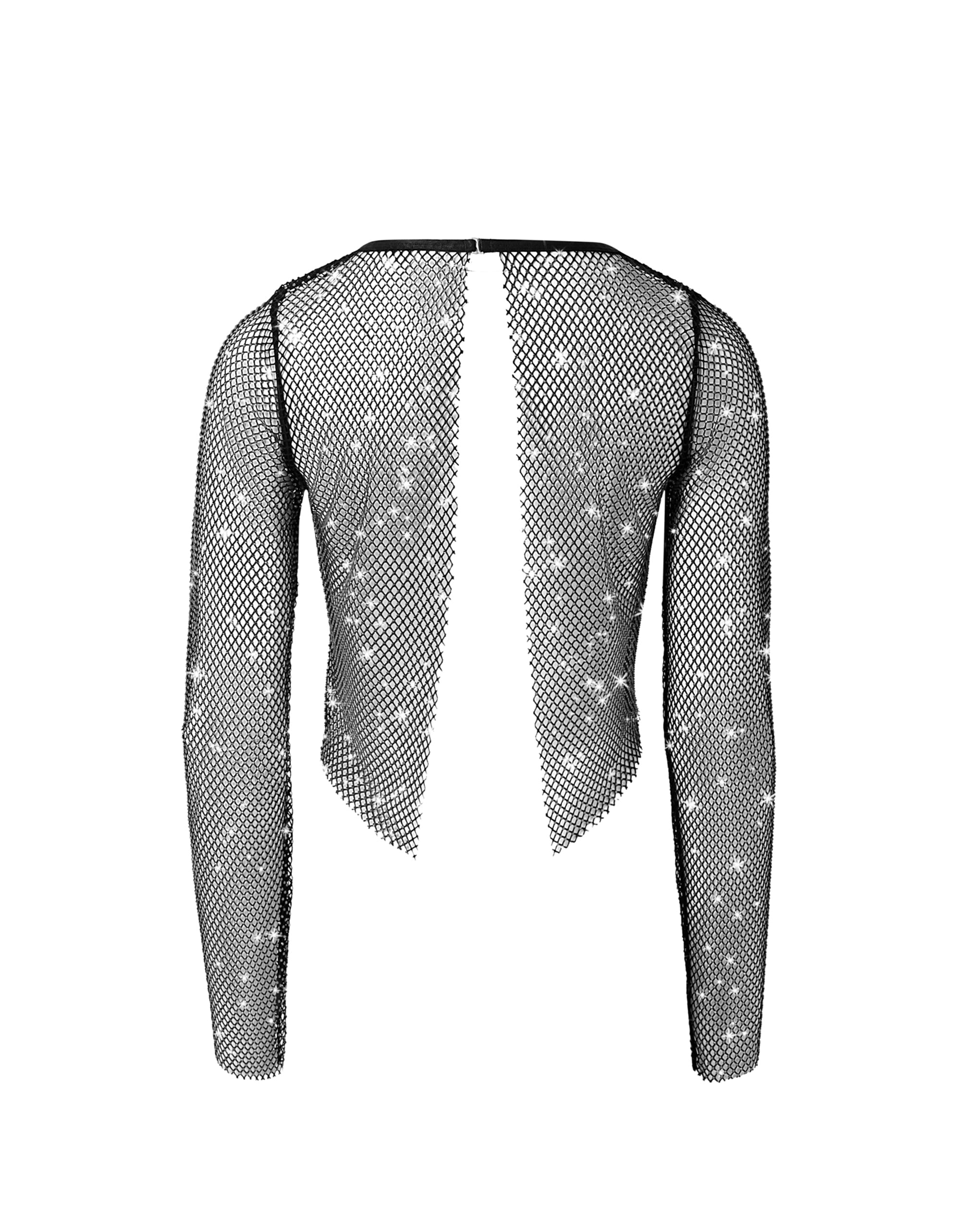 Crafted from a delicate fishnet mesh with rhinestone details that catch the light, featuring long sleeves and an open back for a bold yet elegant silhouette.
