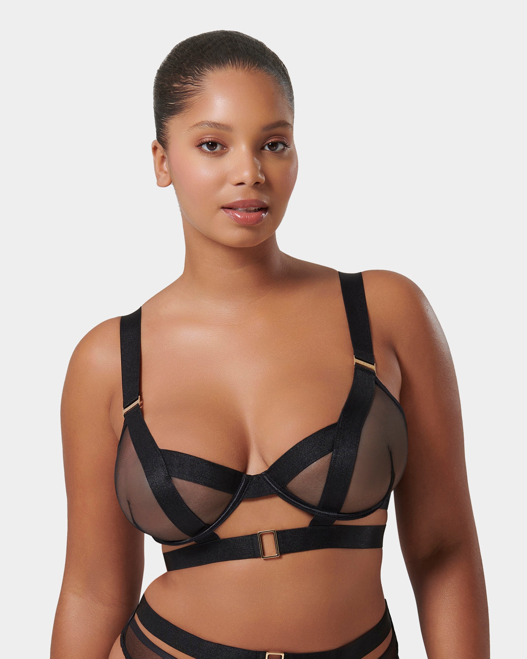 This exquisite piece features wide directional straps over sheer material, offering a unique and eye-catching design with exceptional support and comfort. It is underwired with adjustable straps and a hook-and-eye fastening for a perfect fit.