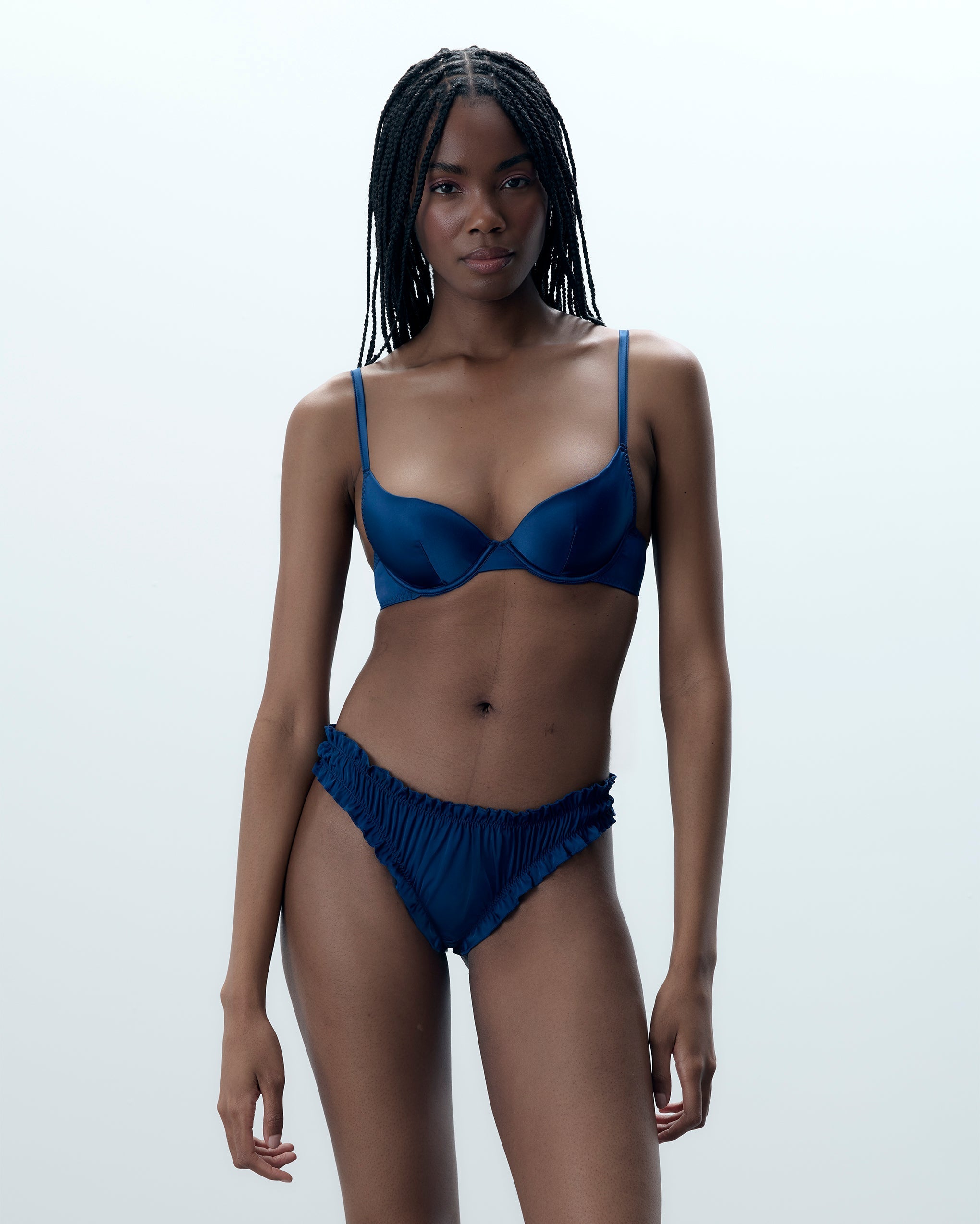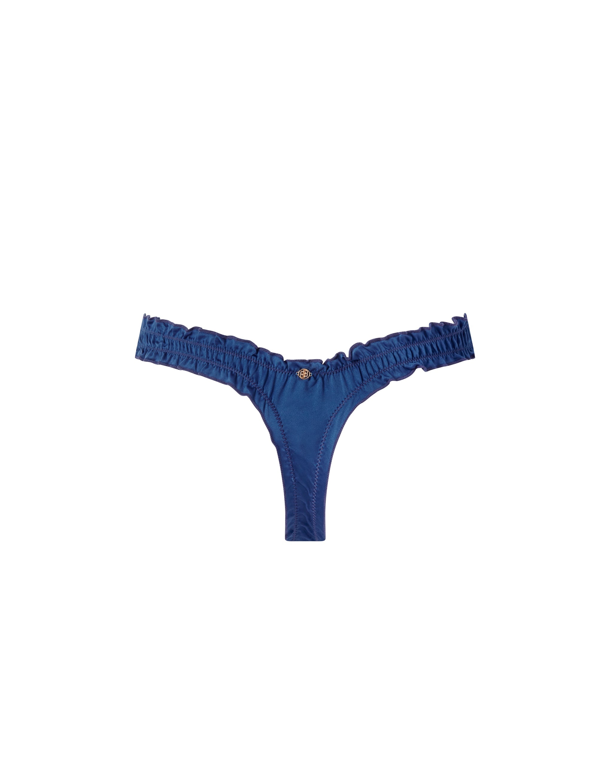 Crafted from smooth luxury satin with delicate ruched ruffle edging and a hypoallergenic bamboo gusset for gentle wear.